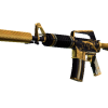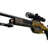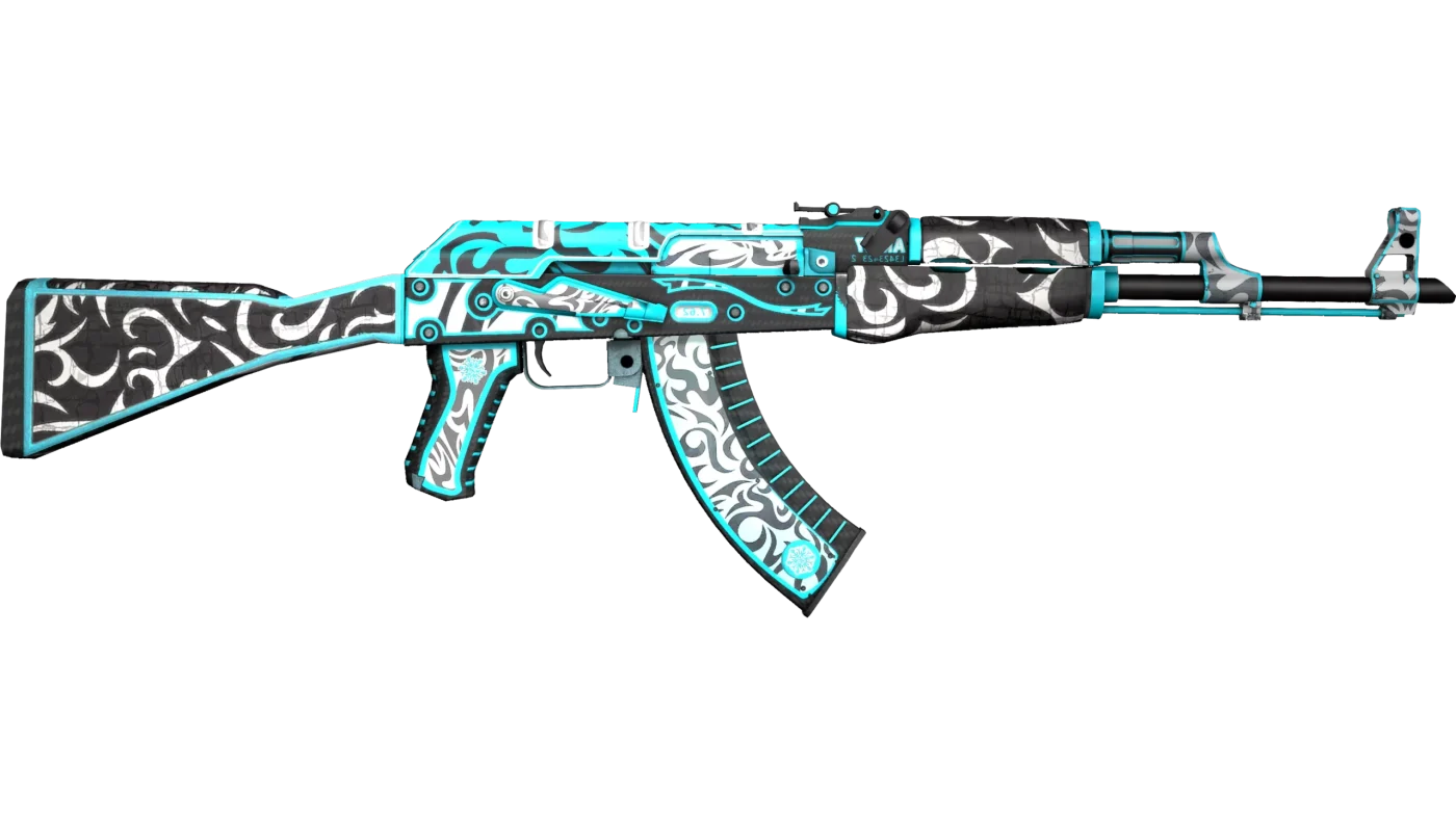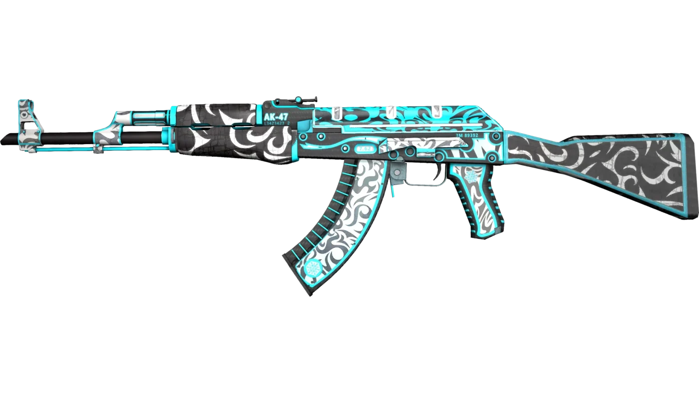 The body of the rifle is painted black and adorned with a white-and-blue pattern consisting of curls and wavy lines. Individual parts of the rifle are complemented by carbon inserts.