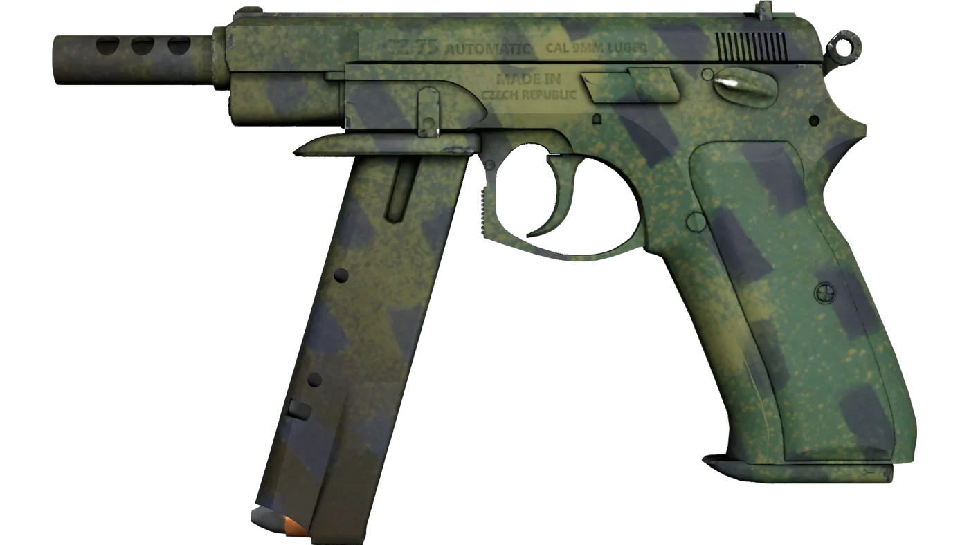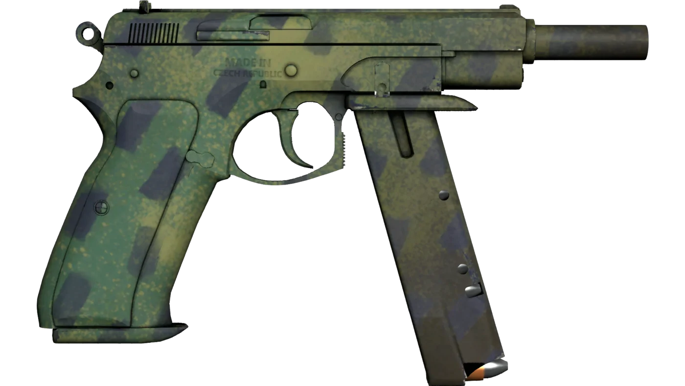 The entire body of the pistol is spray-painted using fragments of duct tape as a stencil. The skin’s color scheme includes gray and various shades of green.