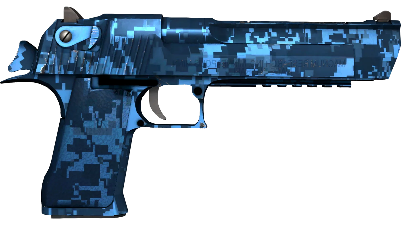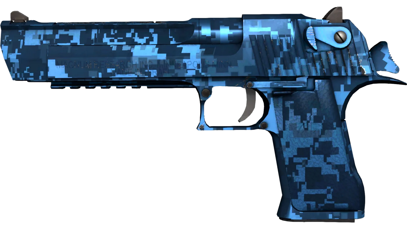 The entire body of the pistol is coated with metal paint and adorned with a pixel camouflage pattern in various shades of blue.