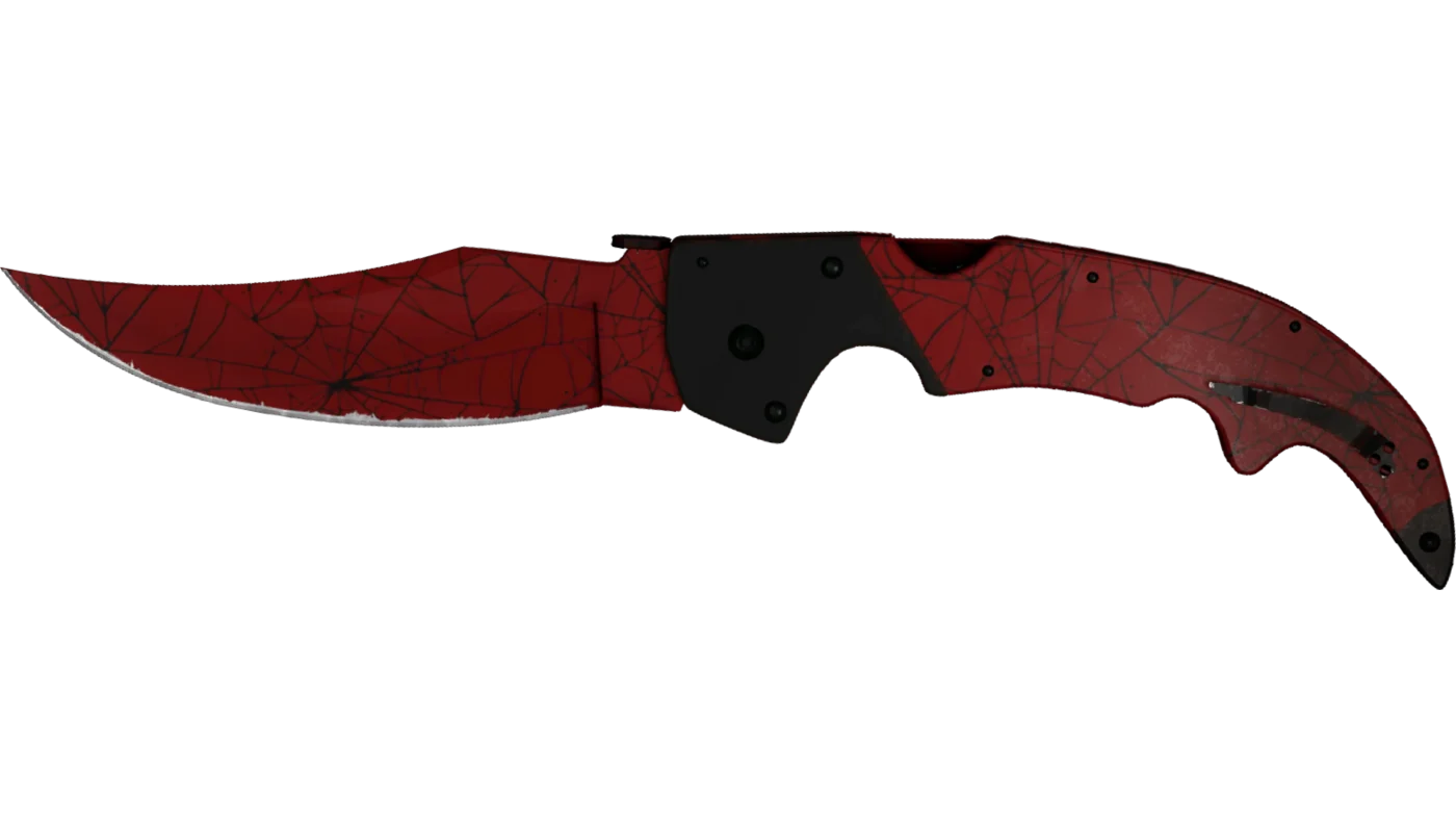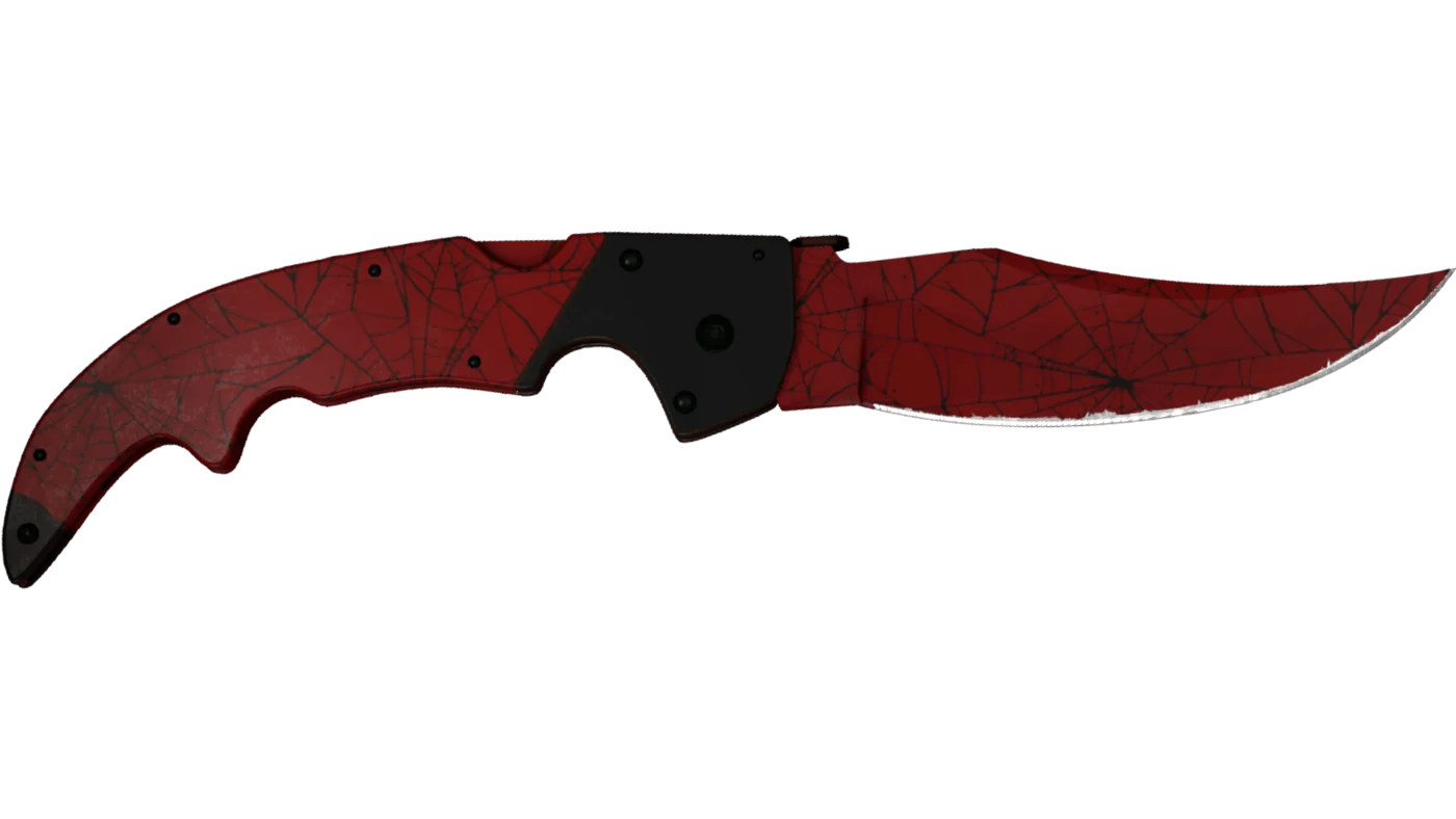 The blade and the main part of the handle are painted red and adorned with a black spider web pattern. The front and the back part of the handle are painted black.