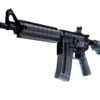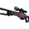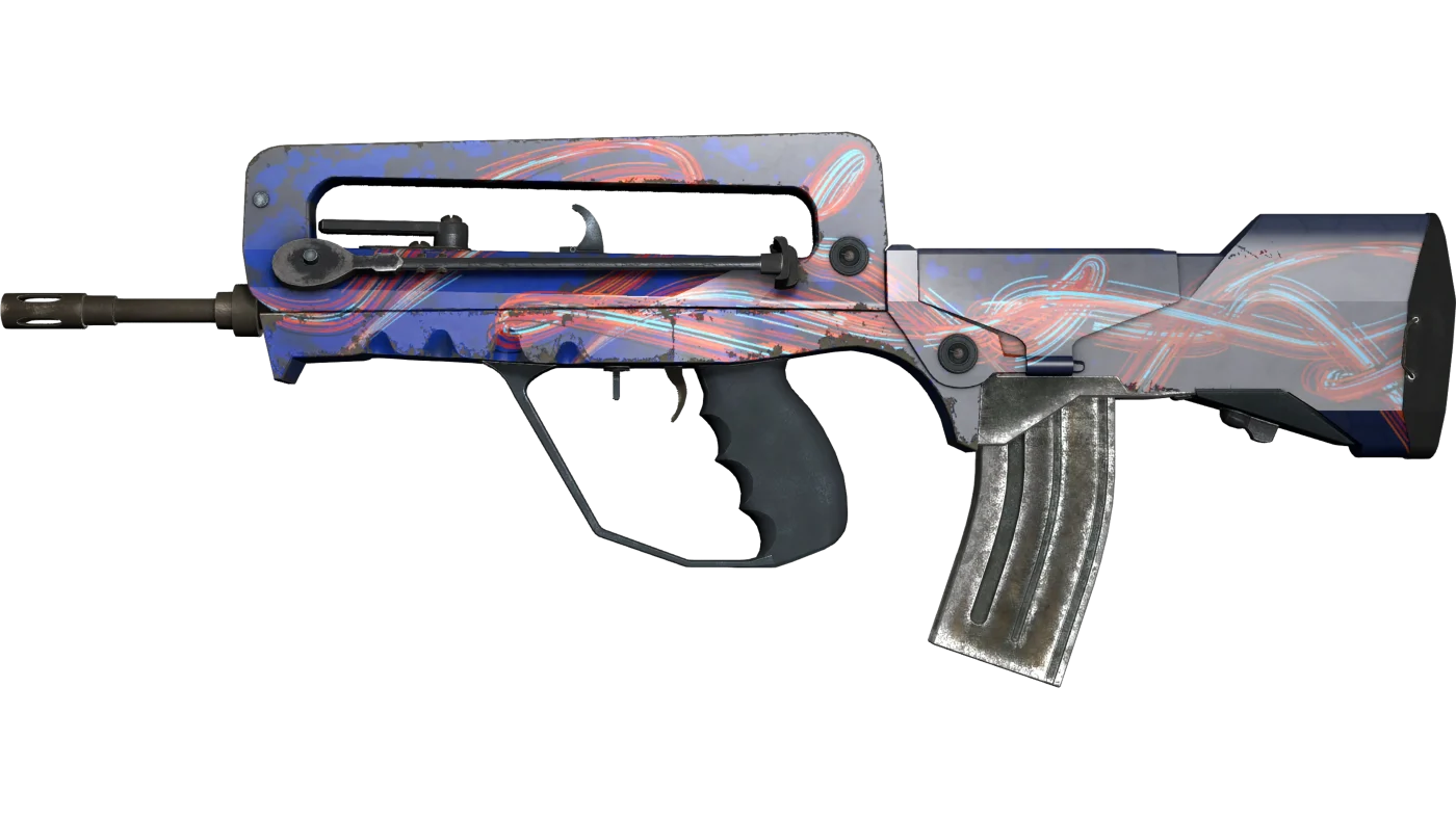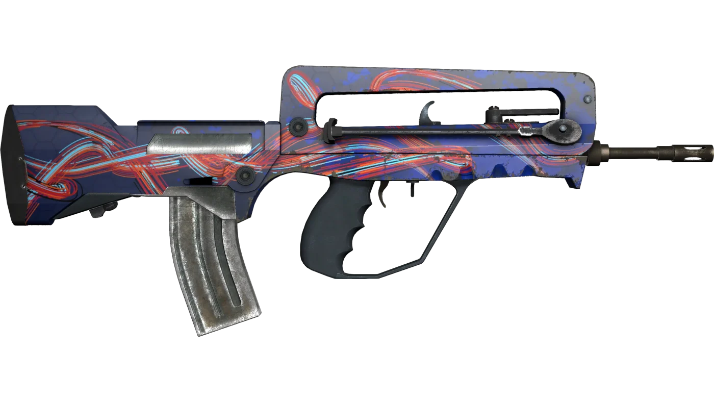 The body of the rifle is unevenly painted blue and gray and complemented by a translucent pattern in the form of a hexagonal grid. The background is adorned with an abstract pattern of intertwined curved lines resembling traces of light. The color scheme of the pattern uses various shades of blue and red.
