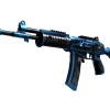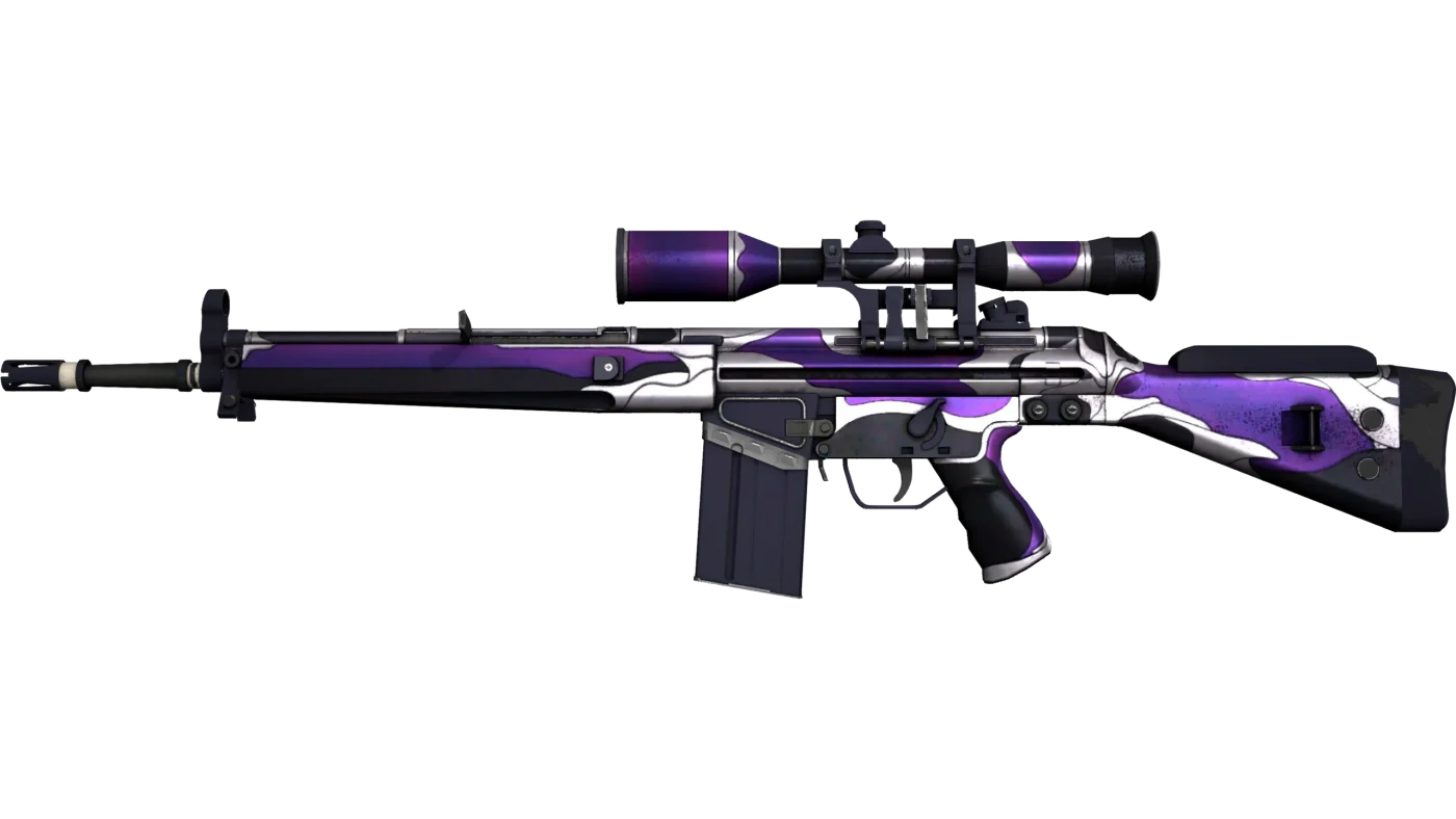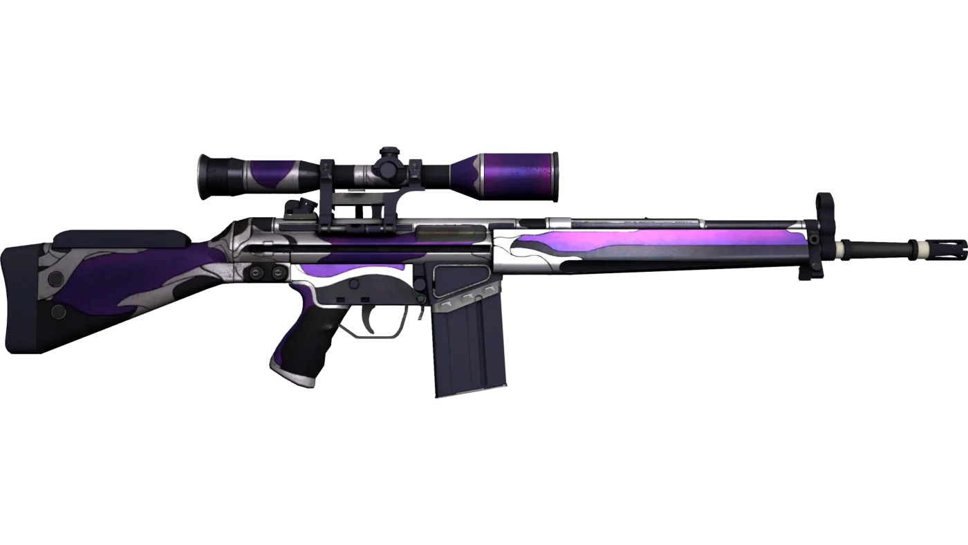 The body of the rifle, the handle and the scope are adorned with an abstract wavy pattern. The color scheme of the skin includes black, purple and silver. The barrel, the magazine and several individual parts of the weapon are not painted.