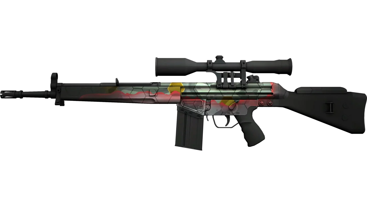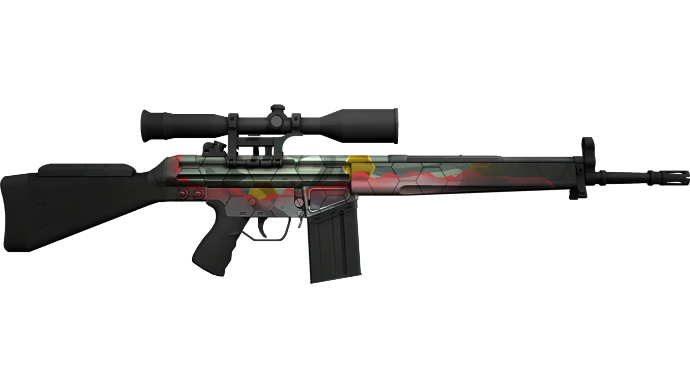 The rifle’s body has been painted with a pattern referring to the Danger Zone’s tactical map display. The map’s fragment features a translucent grid of hexagons. The color scheme of the skin comprises red, yellow, and various shades of green. The scope, magazine, and individual parts of the weapon are painted solid black.