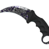 With its curved blade mimicking a tiger's claw, the karambit was developed as part of the southeast Asian martial discipline of silat. The knife is typically used with a reverse grip, with the finger ring on the index finger. It has been painted using a blue camo hydrographic.