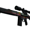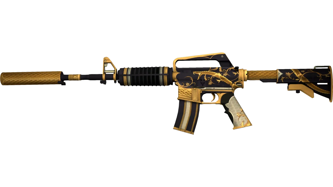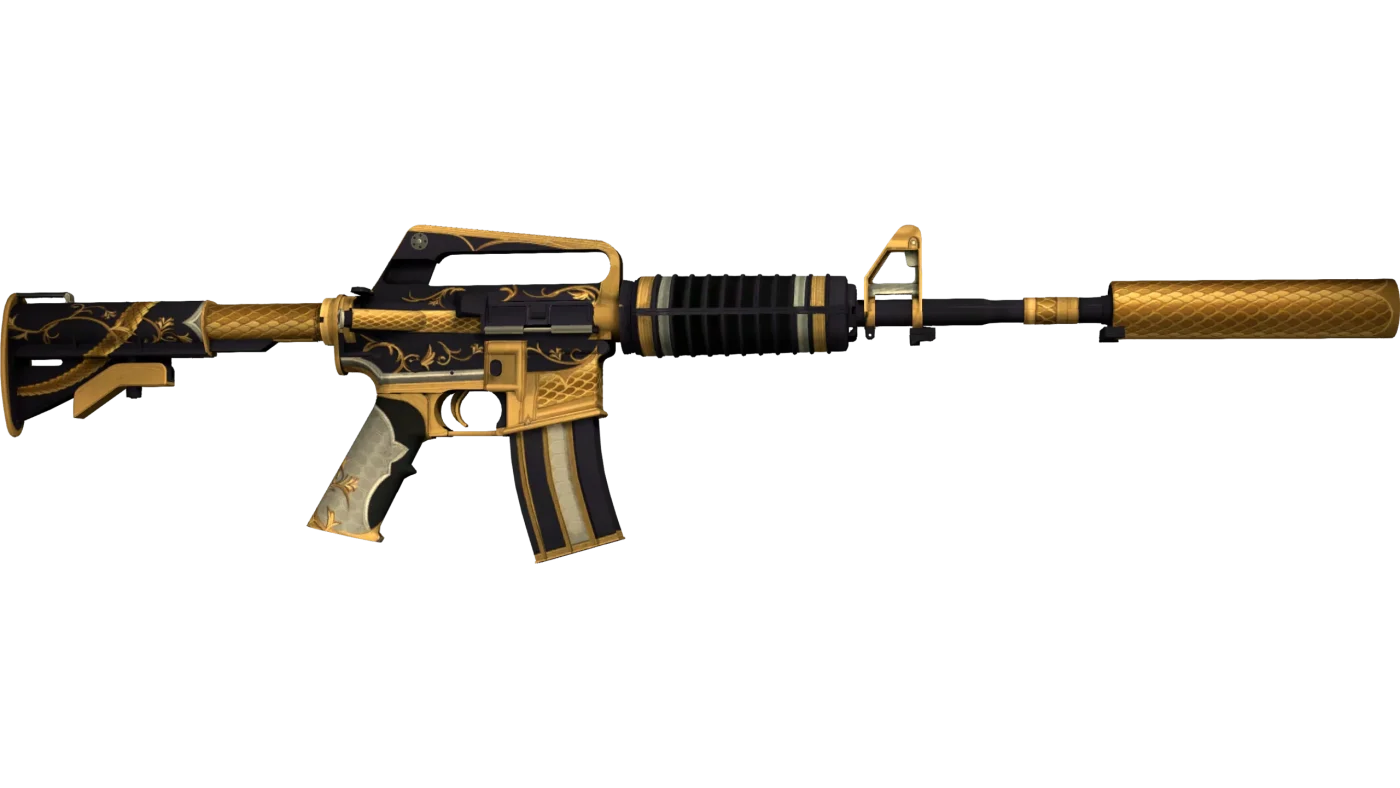 The body of the rifle is coated with black matte paint and adorned with a gold image of an attacking snake surrounded by a floral pattern. A part of the handle is adorned with a beige geometric ornament. The silencer and a part of the buttstock are engraved with a gold pattern imitating snakeskin.