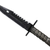This is the M-9 bayonet. Originally intended to be mounted on a rifle, it is also well suited to close-quarters combat. It has been painted in a zebra-stripe pattern with aluminum and chrome paints with various reflectivities, and has then been covered with a tomato red candy coat.