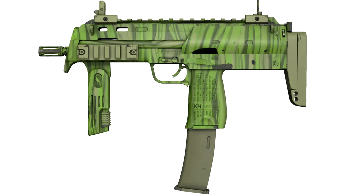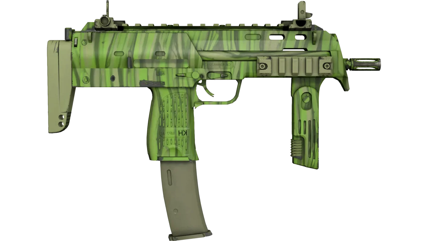 The body of the submachine gun is adorned with a pattern imitating green grass. The buttstock, magazine, and individual small parts of the weapon are coated with olive paint.