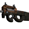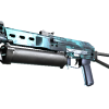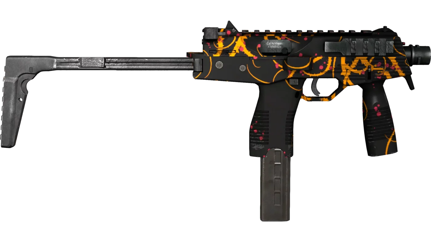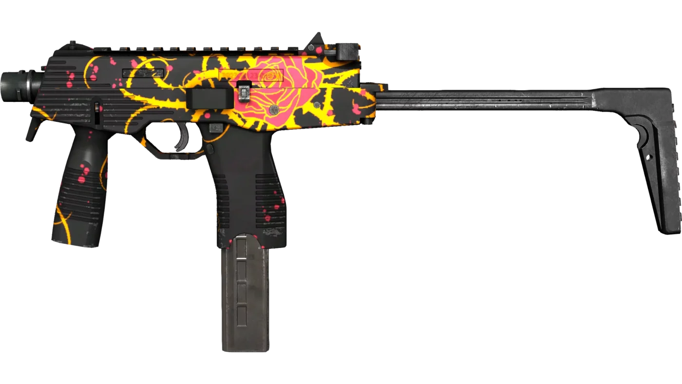 The body of the SMG is coated with matte black paint and adorned with an image of a rose bud surrounded by curly branches with thorns. The color scheme of the pattern includes yellow and various shades of pink. The design is complemented by randomly scattered drips of pink paint. The buttstock, the magazine and individual parts of the weapon are not painted.