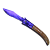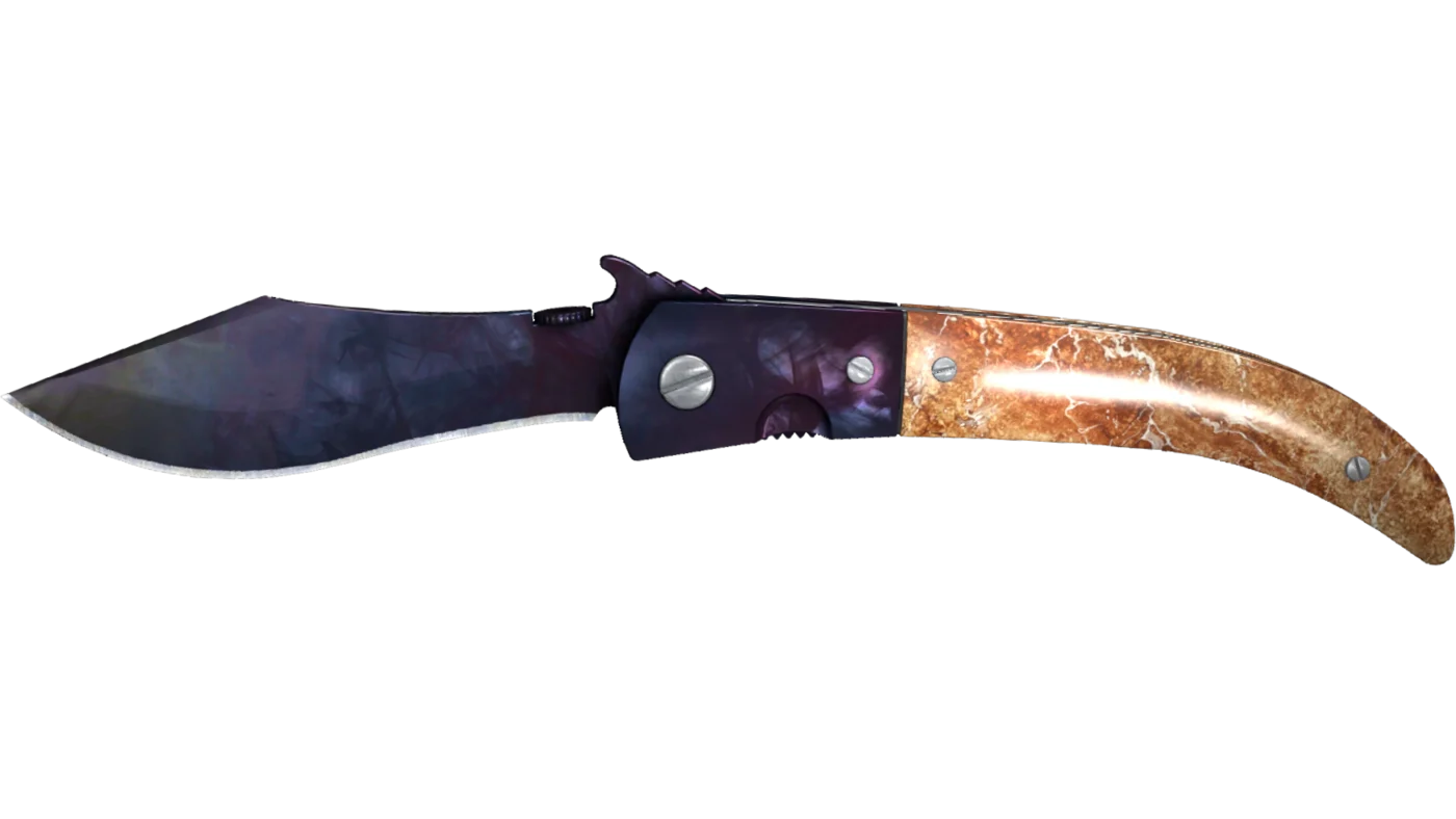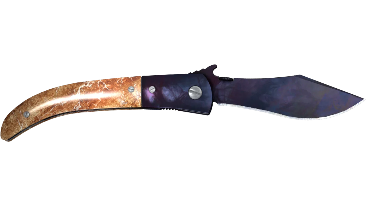The blade and the front part of the handle are painted with metallic paints and adorned with a pattern of translucent wavy lines resembling smoke. The color scheme of the skin uses various shades of blue, purple and crimson creating gradient transitions.