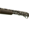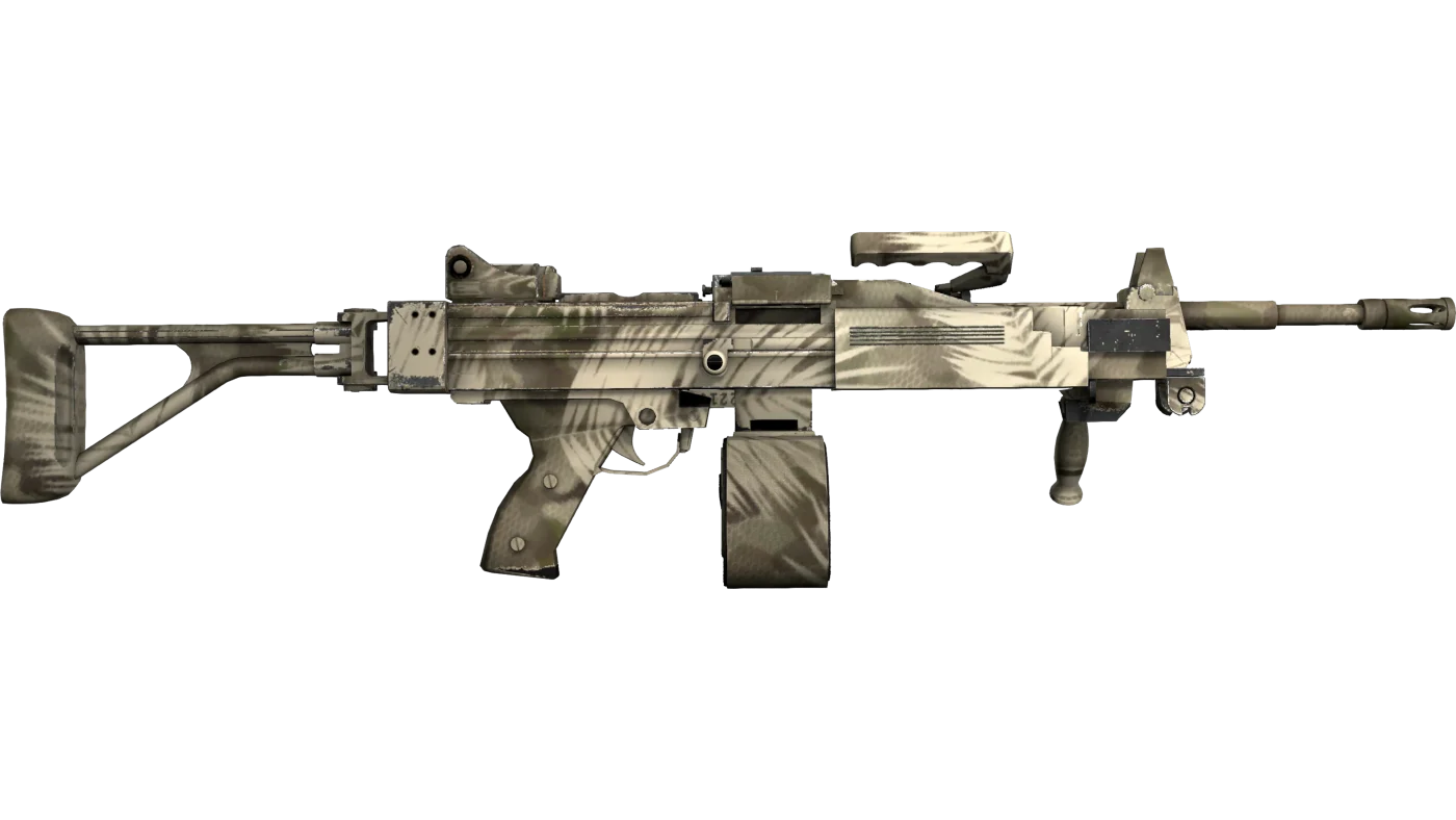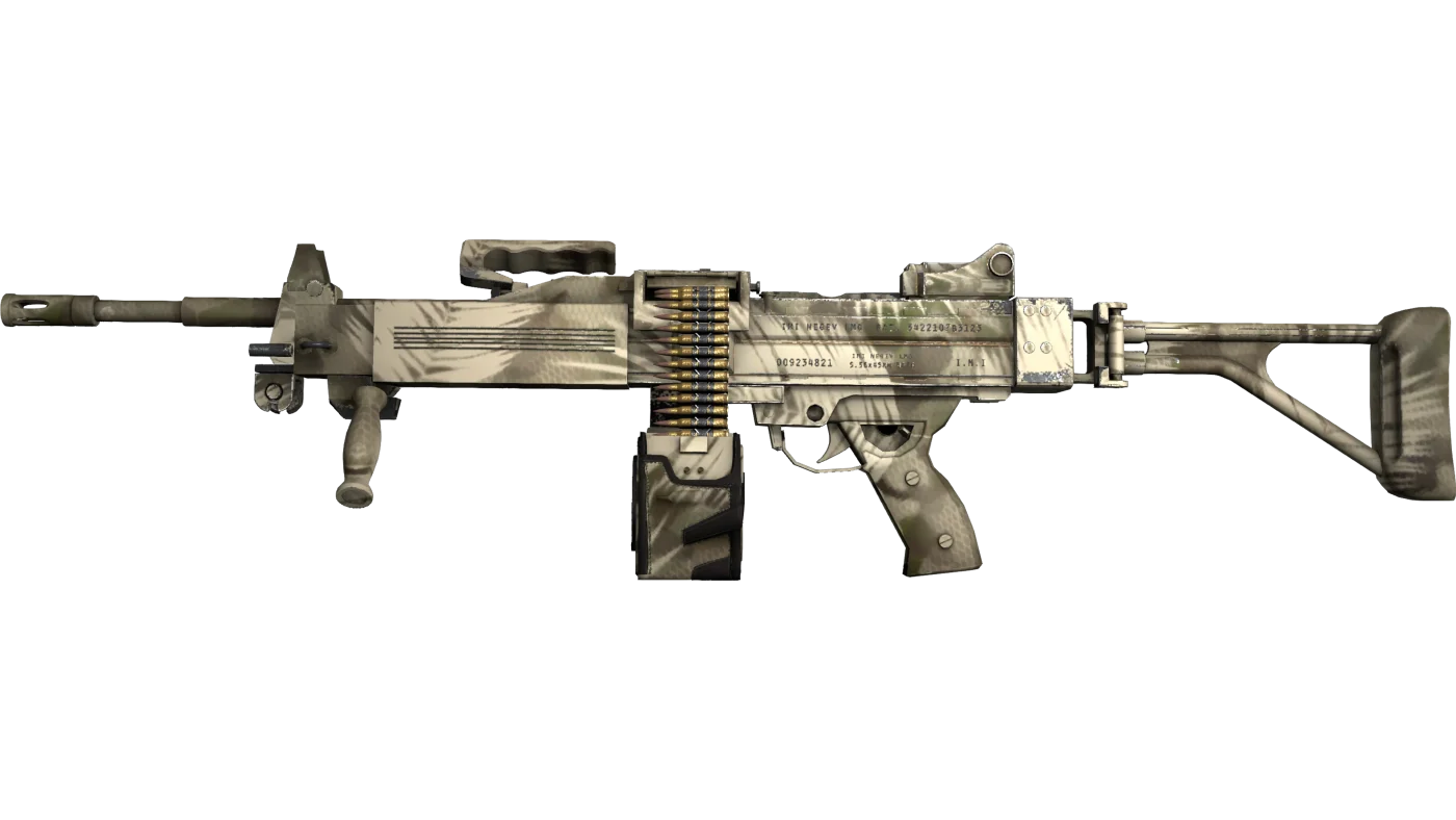 The entire body of the machine gun is spray-painted using mesh and palm leaves as stencils. The color scheme of the pattern includes various shades of beige and khaki.