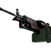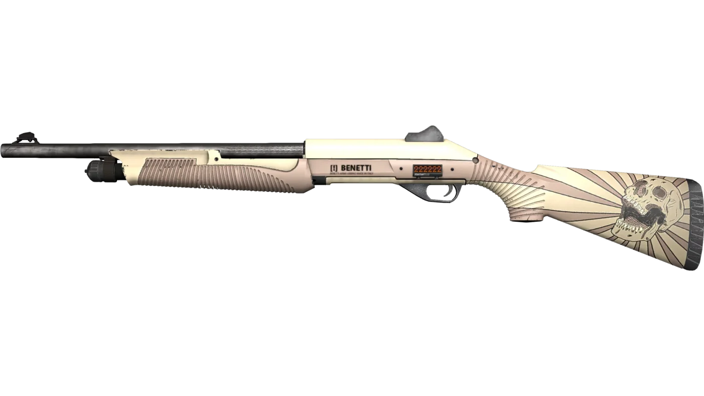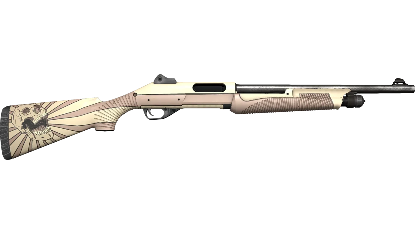 The design of the skin is made in beige colors. The buttstock is adorned with an image of a human skull with an open mouth. The skull radiates dark beige rays with a black outline. The barrel and individual parts of the weapon are not painted.