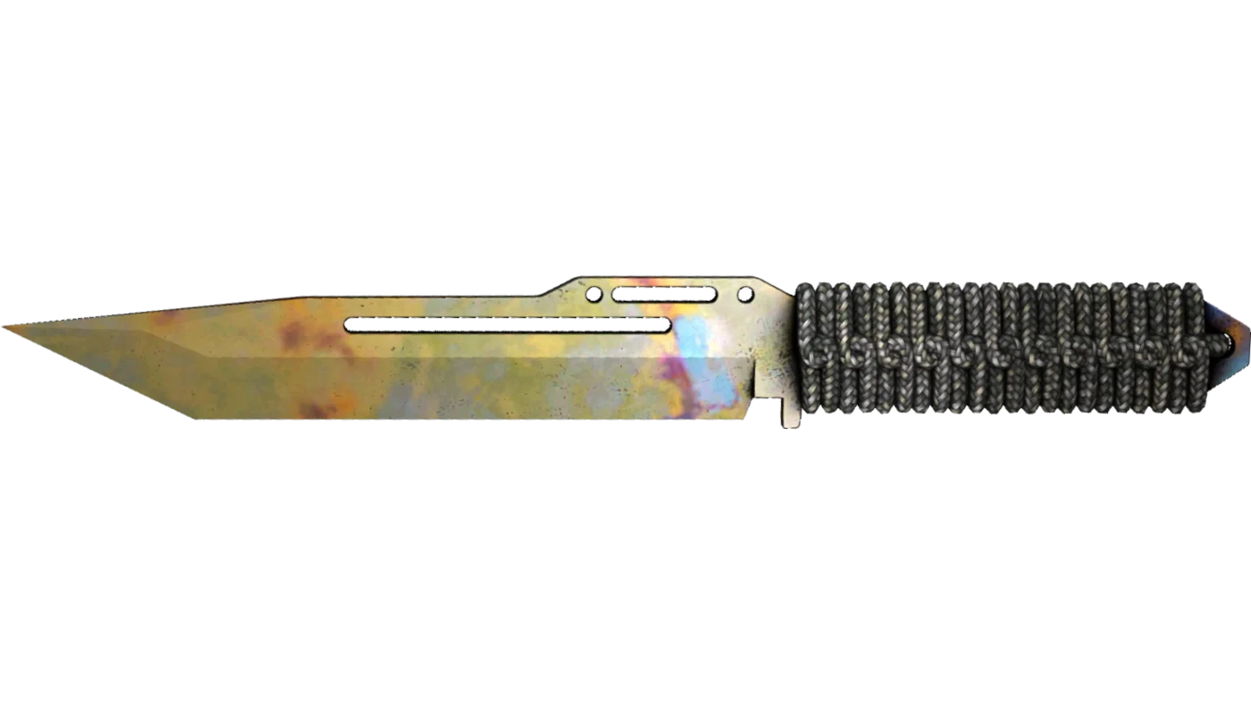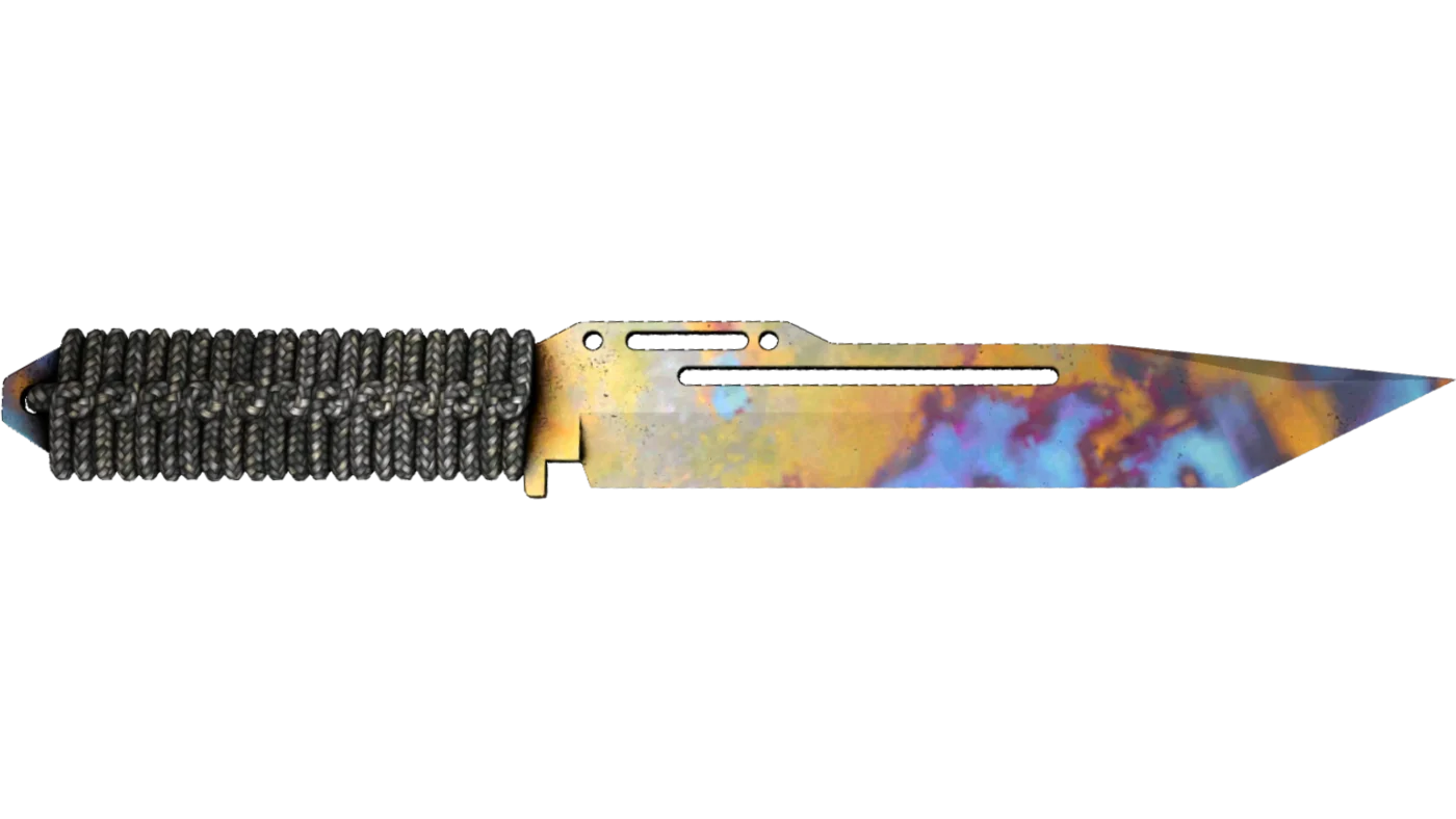 The hardened blade of the knife is covered with blue, violet, and yellow stains. The handle remains unpainted.