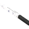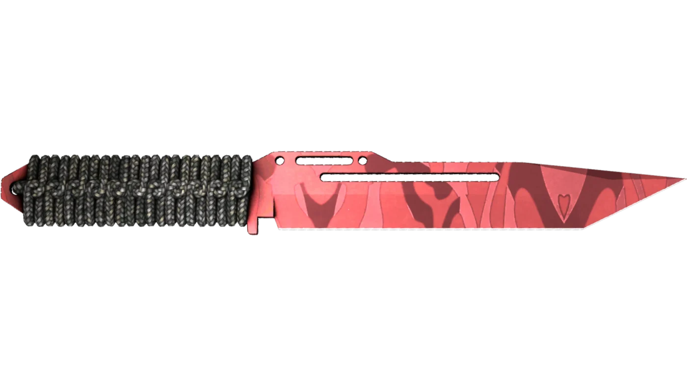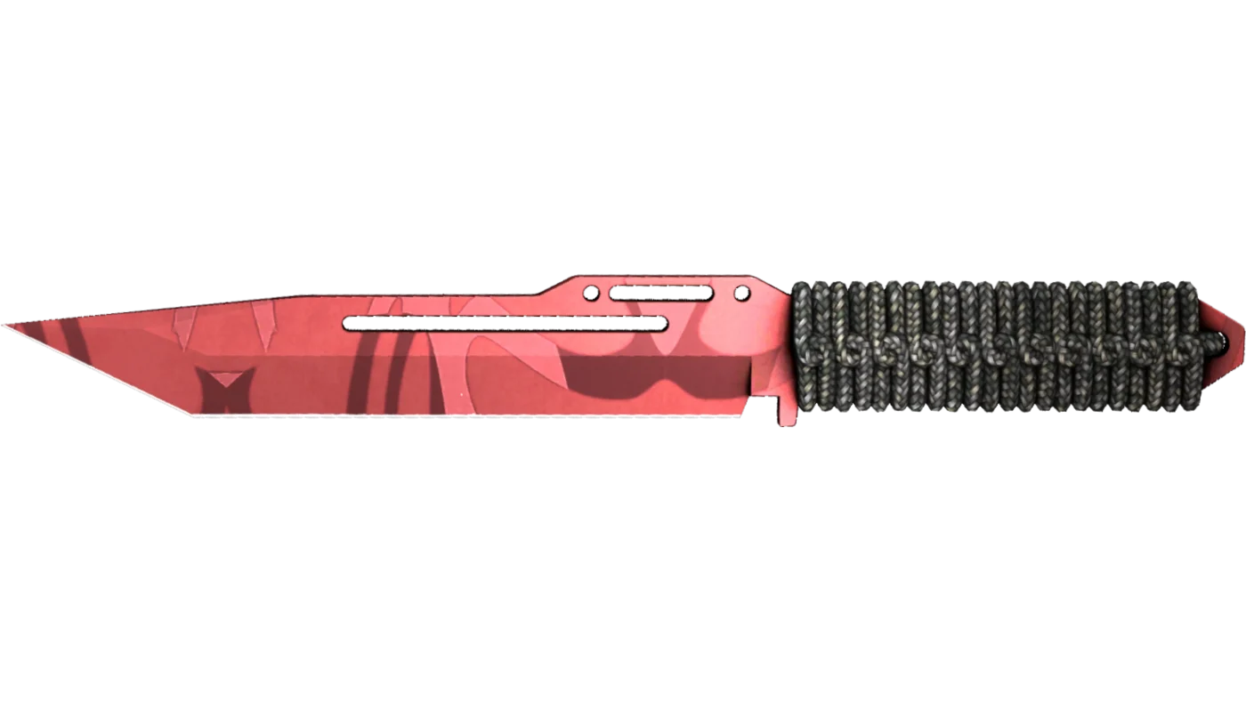 The blade of the knife is adorned with an abstract pattern made with aluminum and chrome paints and coated with red translucent paint.