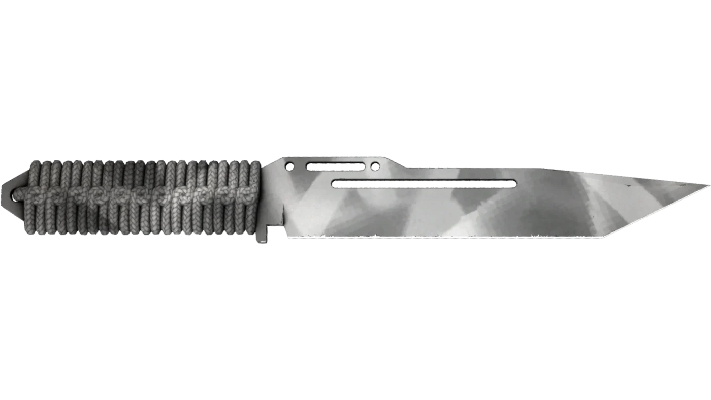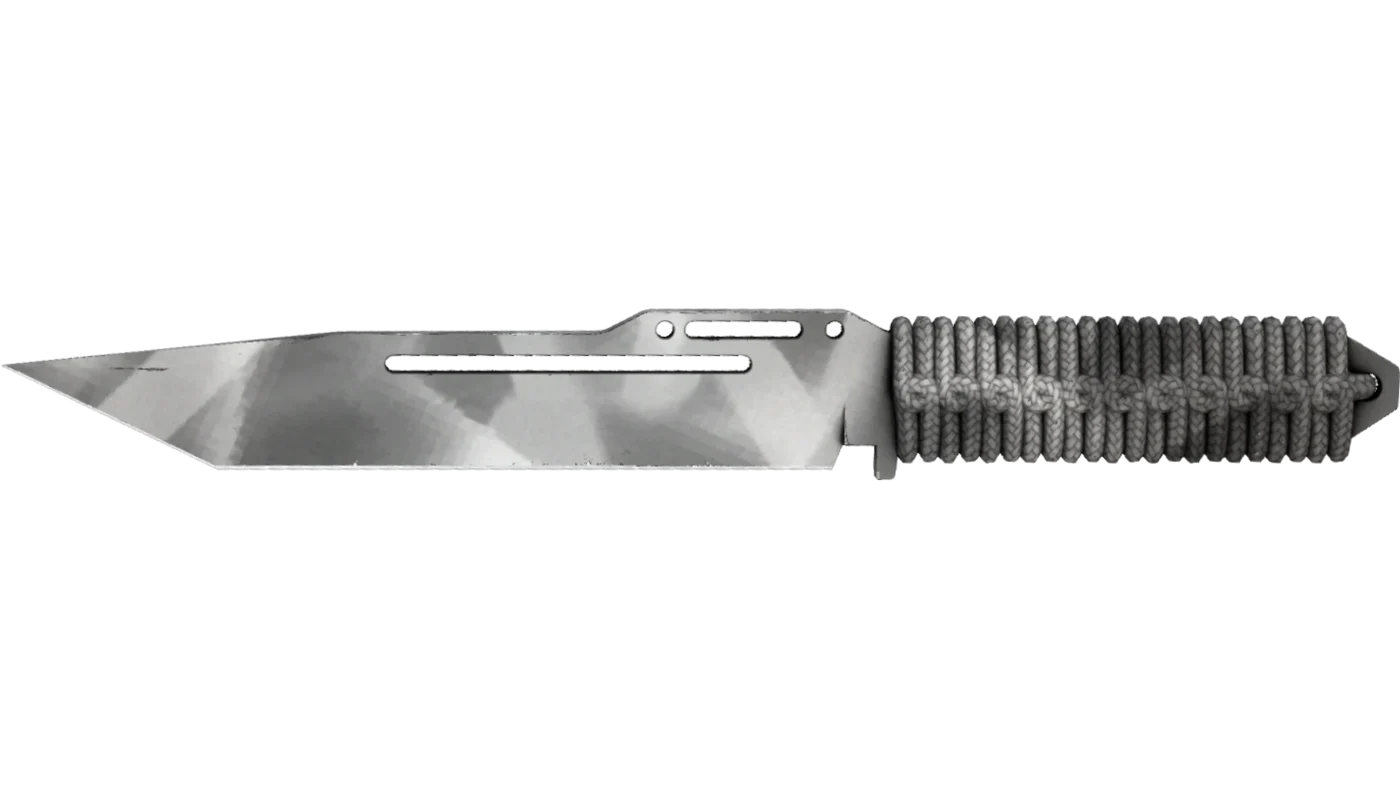 The entire body of the knife including the handle is spray-painted in various shades of gray. The pattern is applied through a tangle of masking tape used as a stencil.