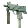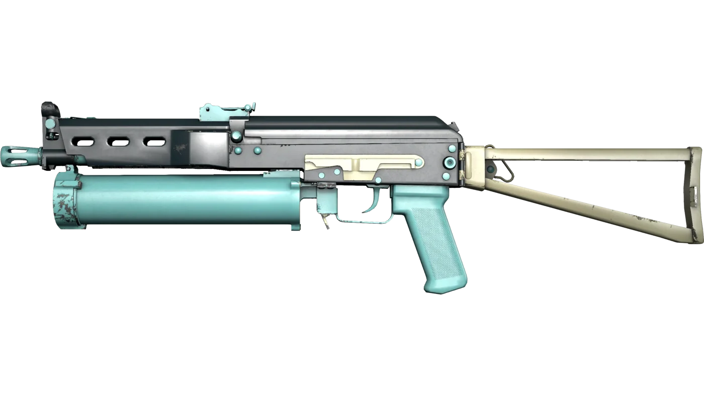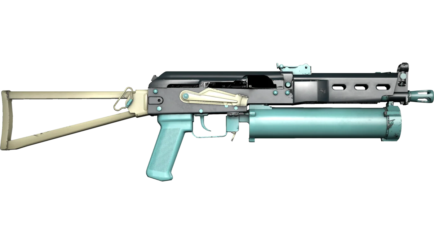 The body of the submachine gun is coated with dark gray glossy paint. The magazine, the handle and the barrel are made in teal color. The buttstock is painted in a light shade of beige.