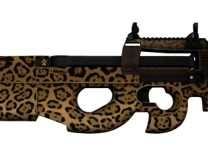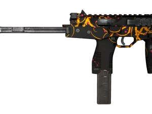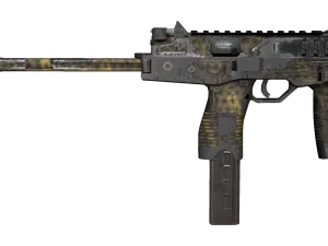 The receiver and the magazine are painted dark gray and complemented by a pattern of blue wavy lines. The background is adorned with gray circled images of surging waves. The buttstock and individual parts of the weapon are solid black. The handle is painted dark blue.