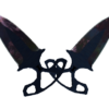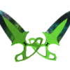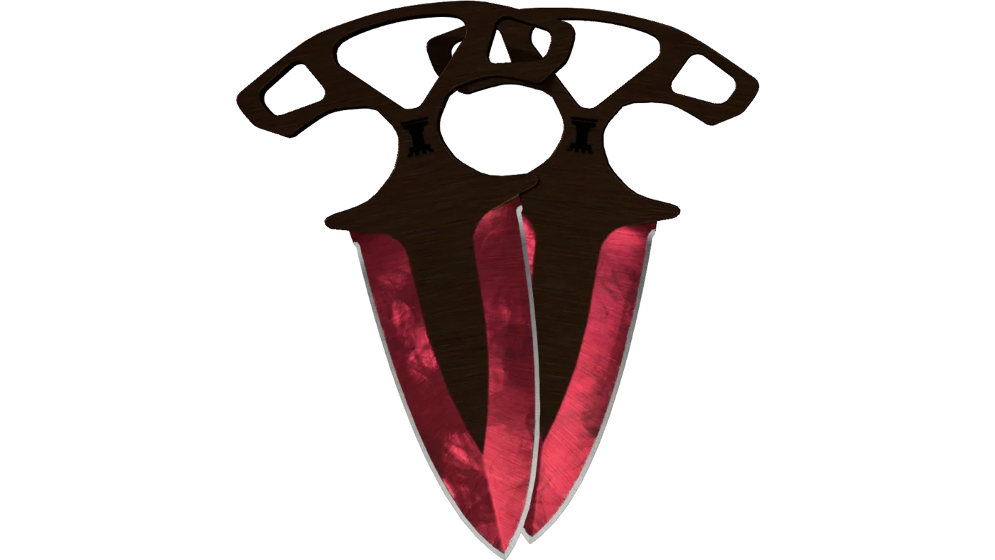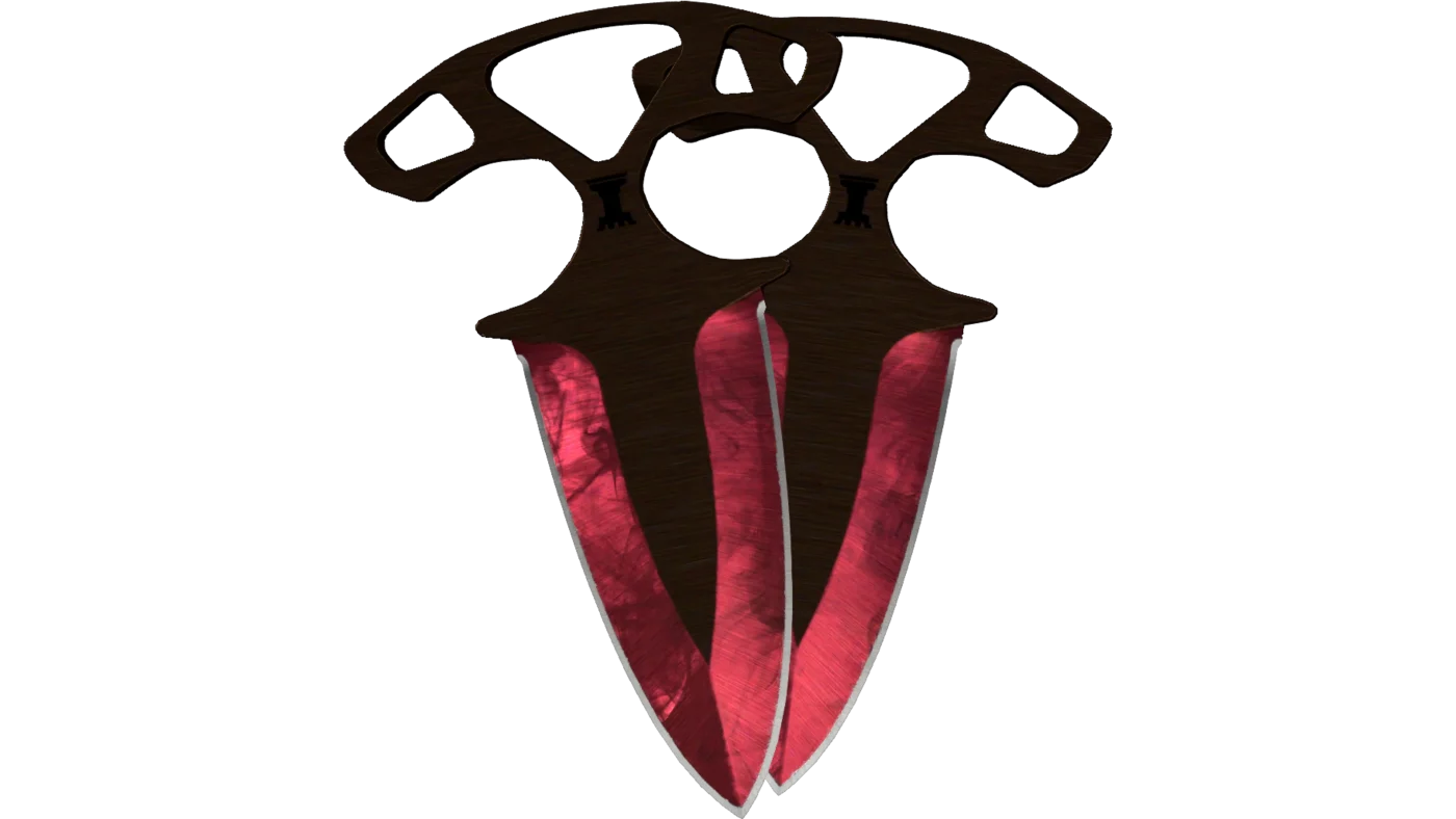 The blades of the knives are painted with metallic paints and adorned with a pattern of translucent wavy lines resembling smoke. The color scheme of the skin uses various shades of red creating gradient transitions. The design of the skin resembles the texture of the ruby. The handles are painted brown.