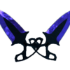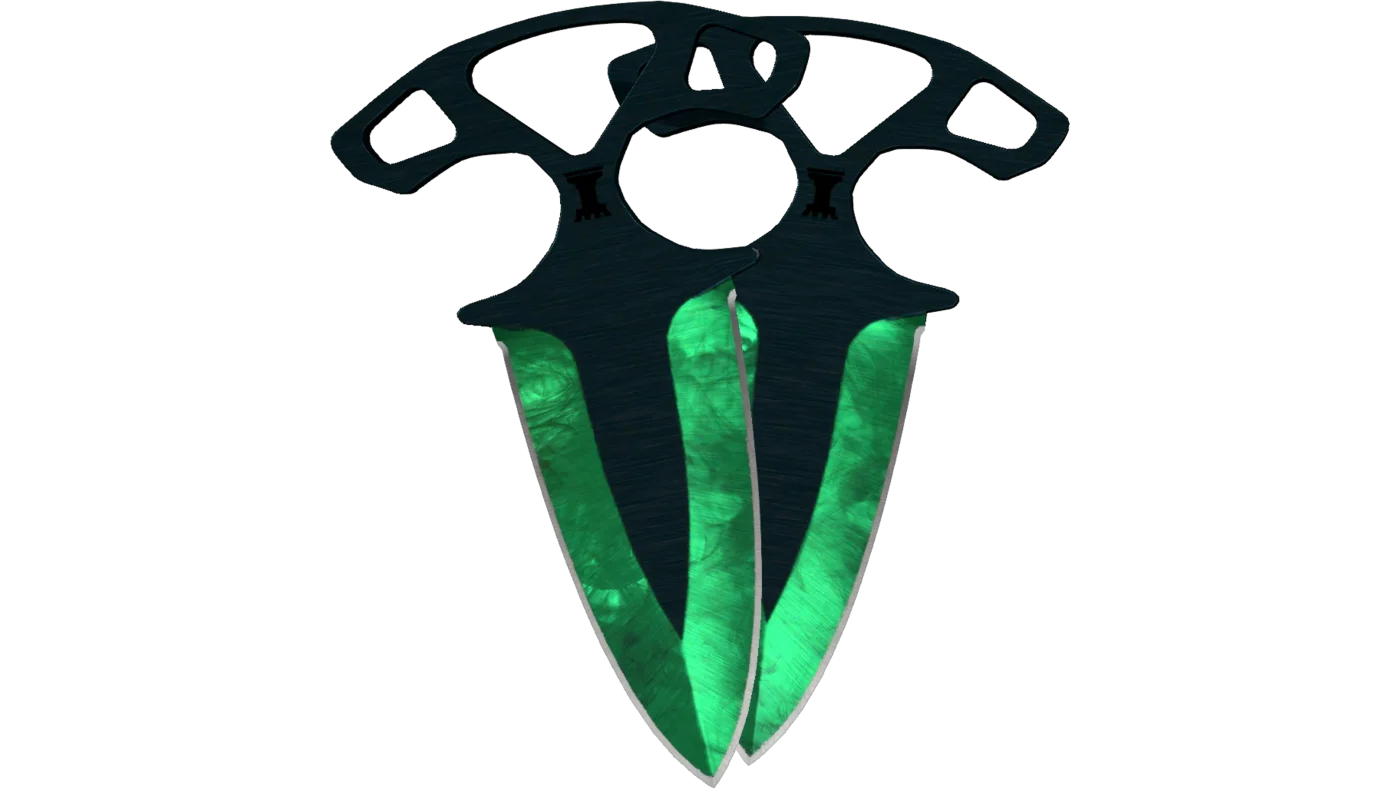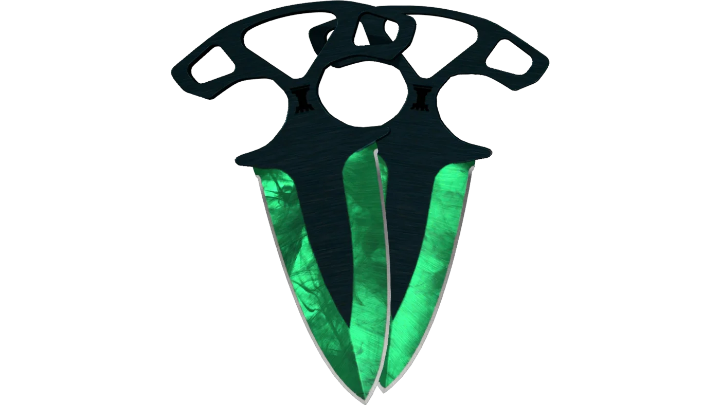 The blades are coated with metallic paints and adorned with a pattern of translucent wavy lines resembling smoke. The skin’s color scheme comprises various shades of green creating gradient transitions and resembling the texture of emerald.