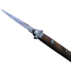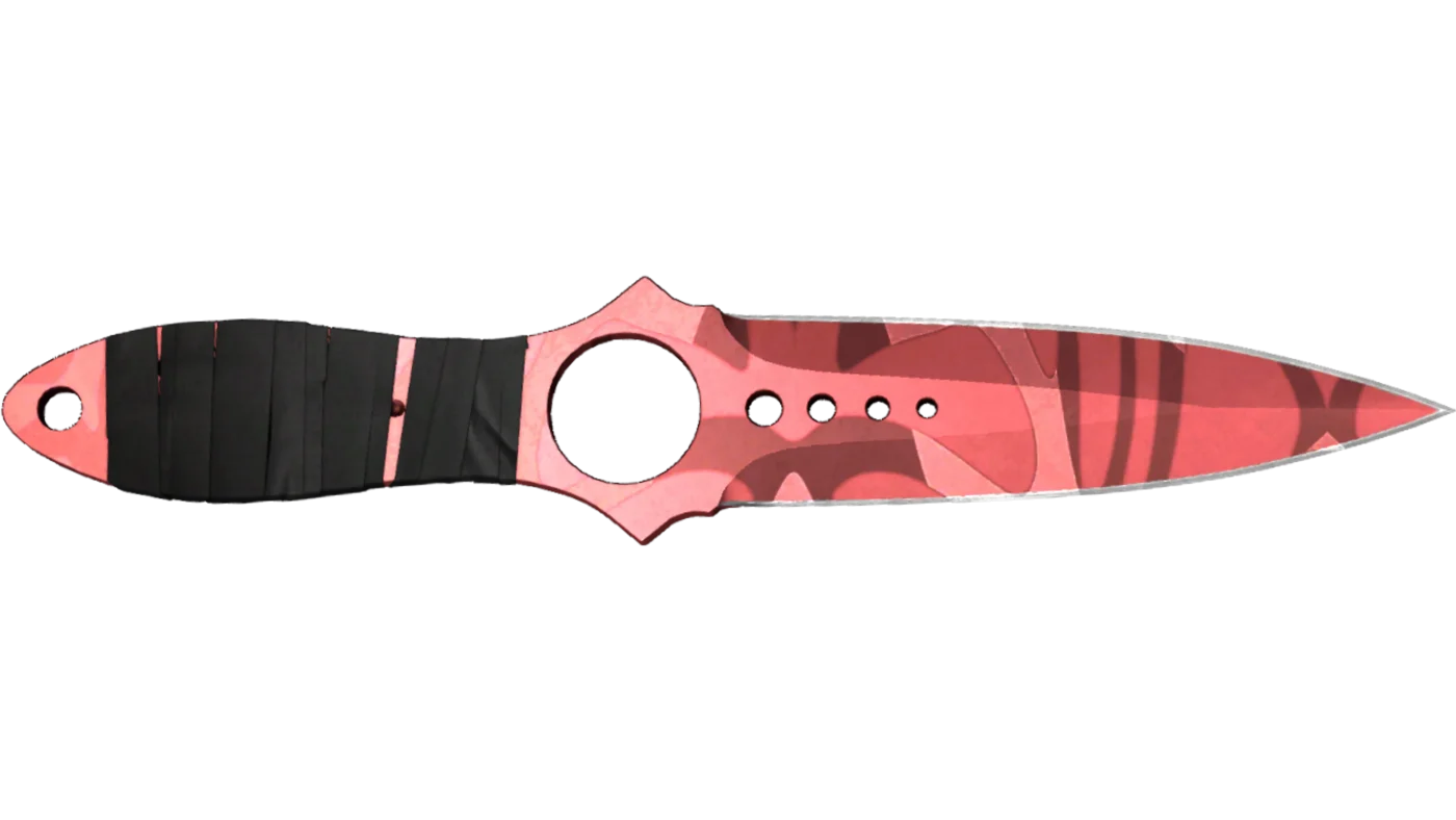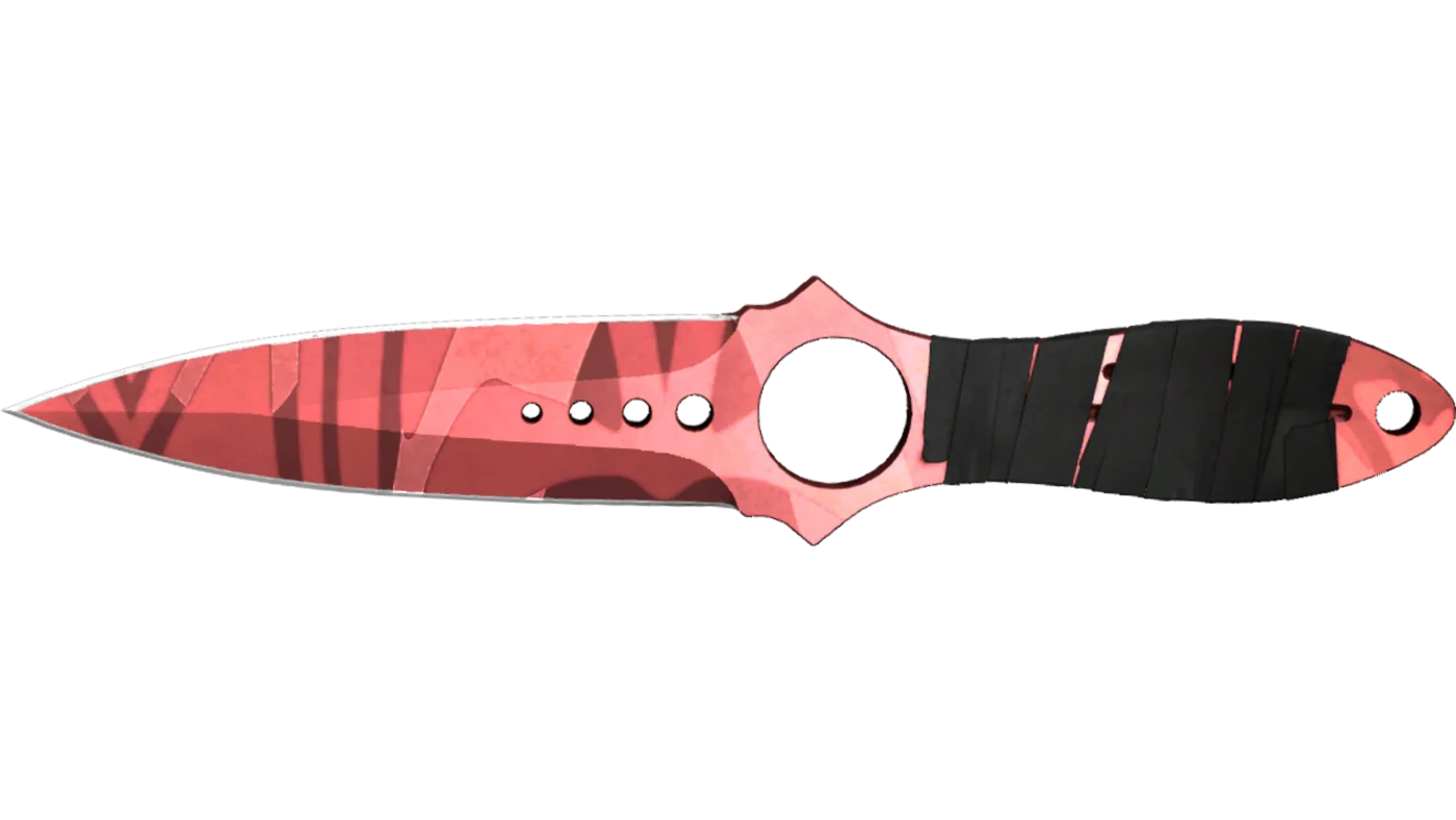 The blade of the knife is adorned with an abstract pattern made with aluminum and chrome paints and coated with red translucent paint. The handle remains unpainted.