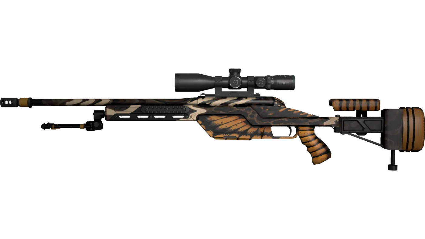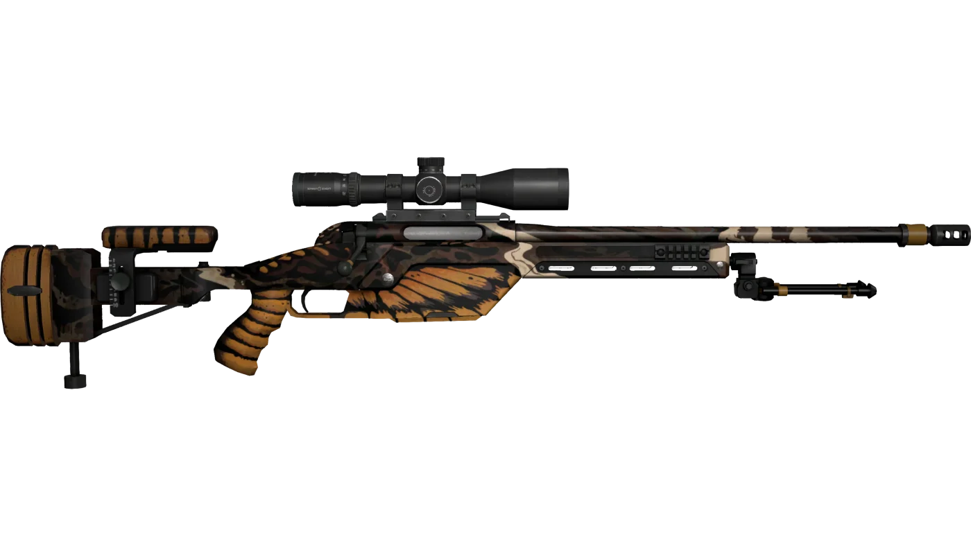 The entire body of the rifle is adorned with an animalistic print that imitates the color of the butterfly “Death’s Head”. The color scheme of the skin includes various shades of brown, yellow and gray. The scope and individual small parts of the weapon are not painted.