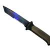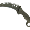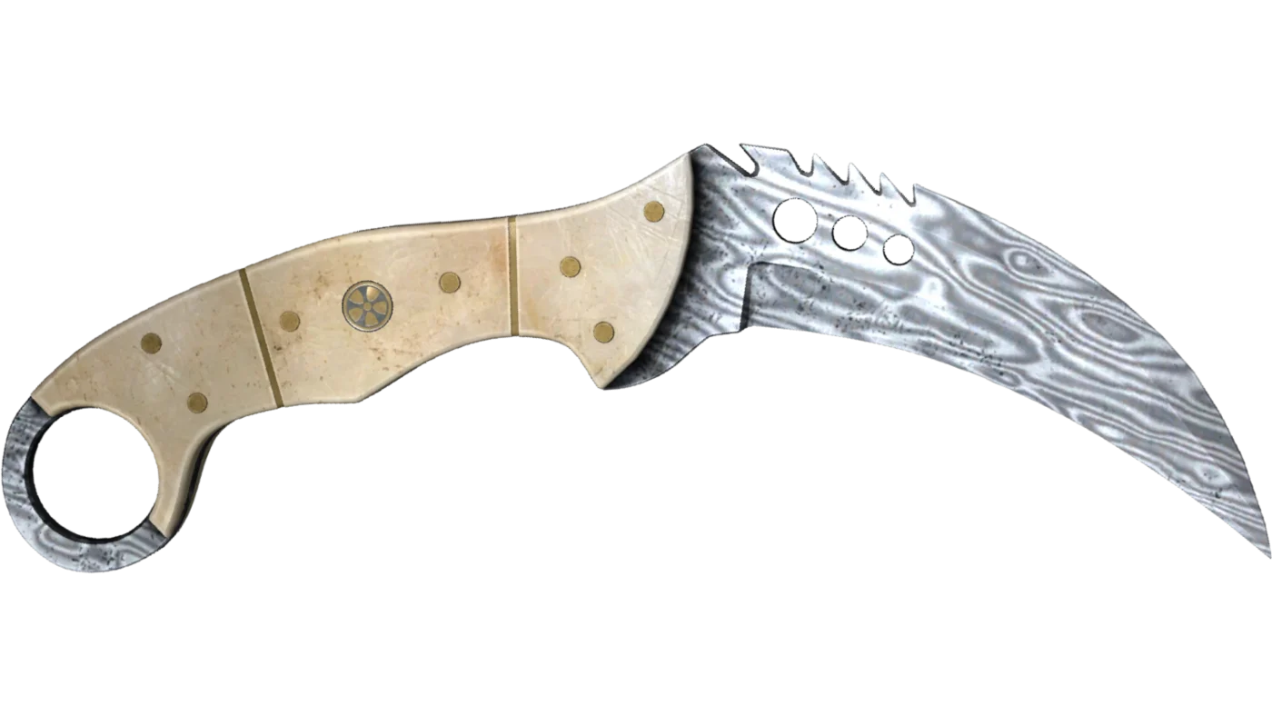The blade of the knife is made of two different types of steel, which create a pattern of dark gray and light gray wavy lines. The handle remains unpainted.