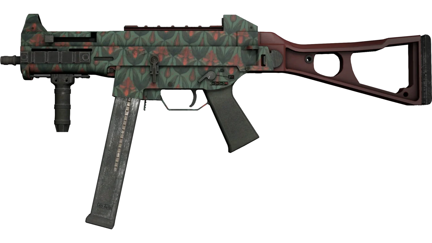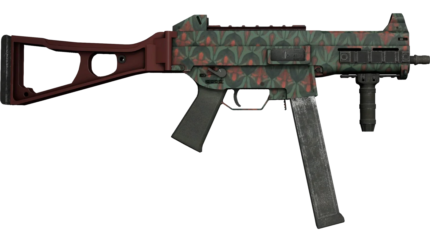 The green body of the submachine gun is adorned with a pattern of blooming lilies painted in various shades of green and red. The buttstock is painted solid brown, individual parts of the weapon remain unpainted.