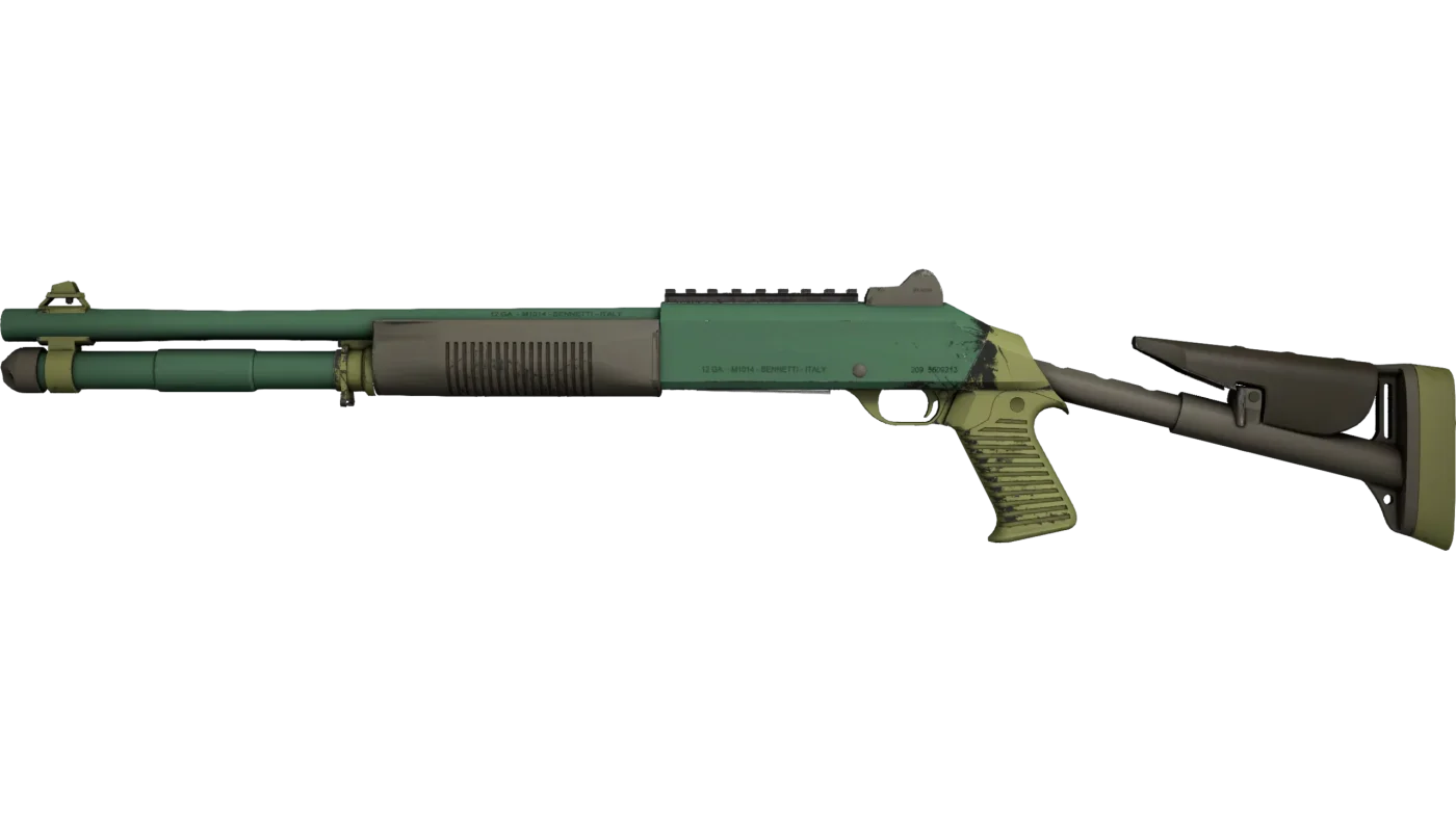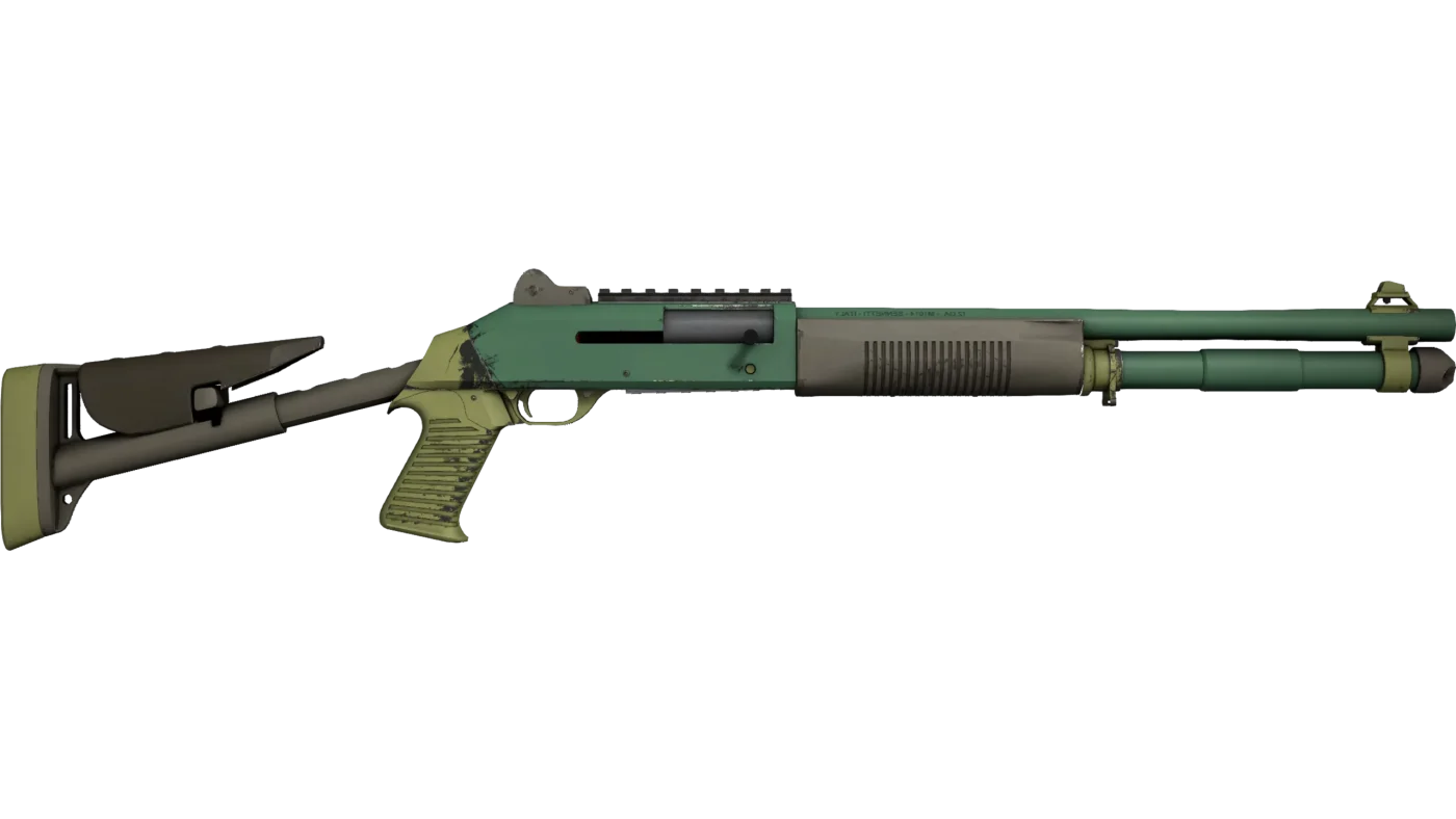 Individual parts of the shotgun are painted in various shades of green and brown.