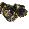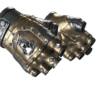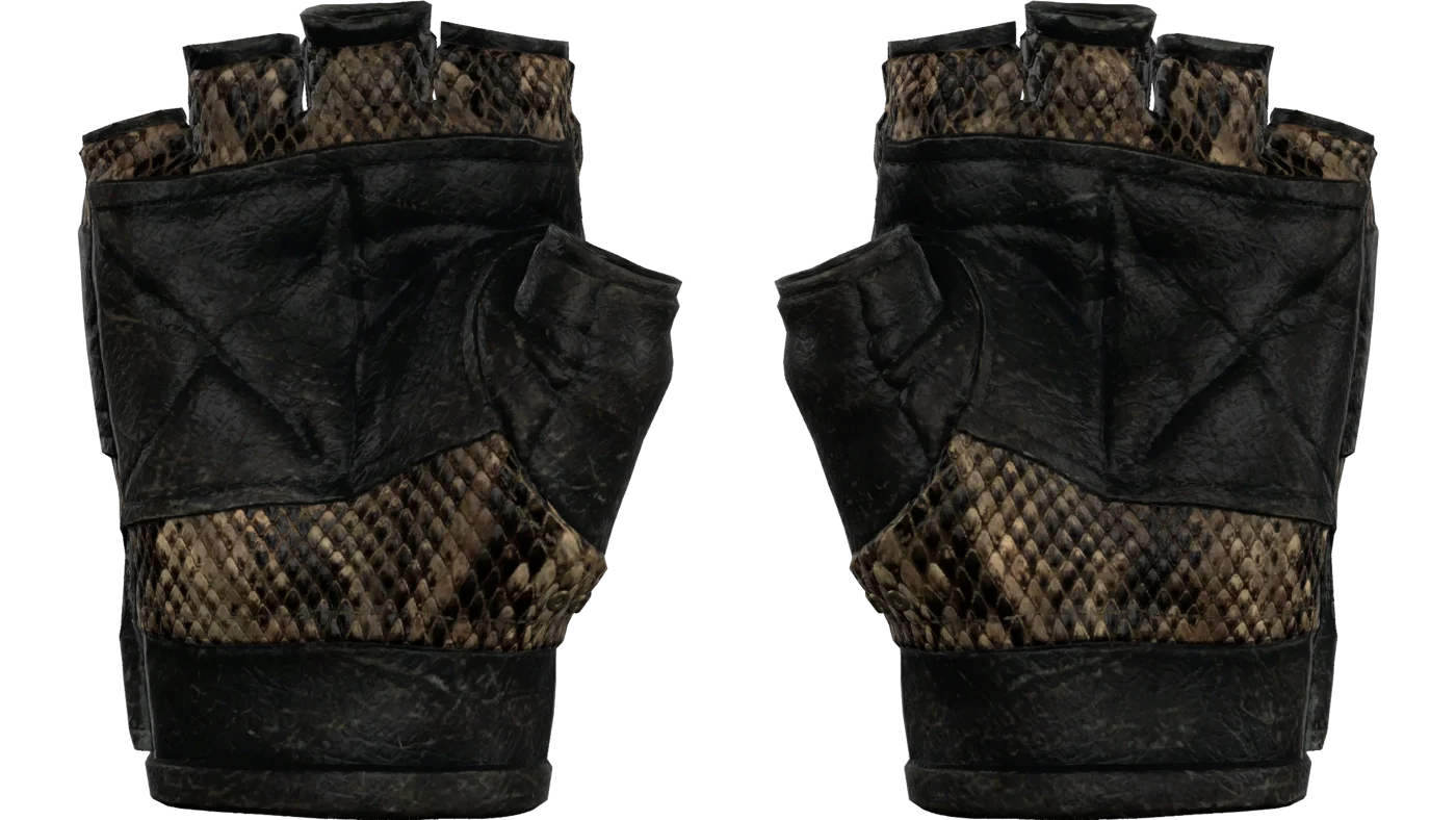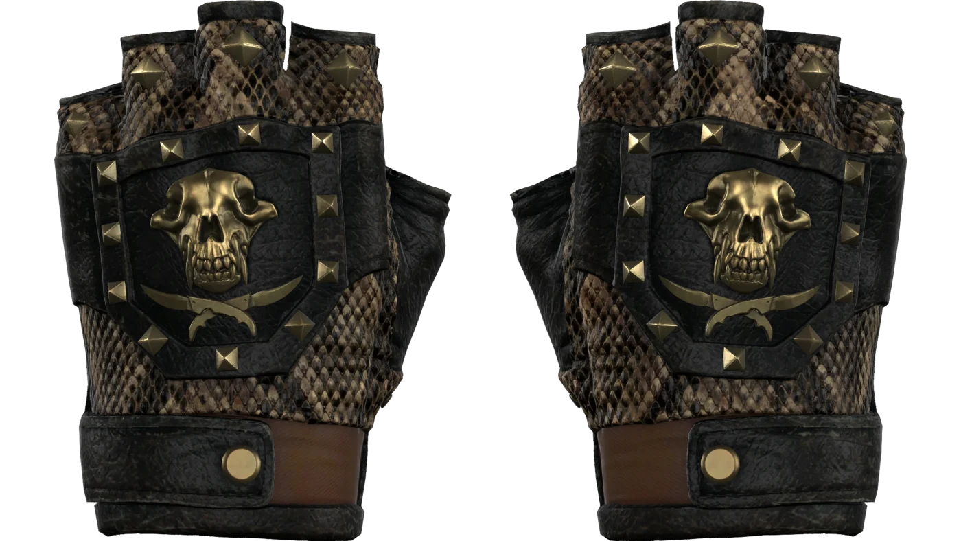 As luvas são feitas de couro marrom escuro e pele de cobra marrom-bege. O design é complementado com rebites dourados e os logotipos da Operação Bloodhound.