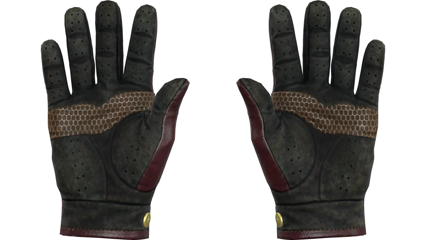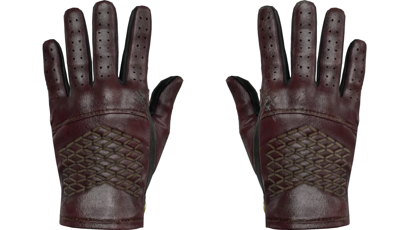A parte externa das luvas é feita de couro burgundy e parcialmente decorada com um padrão xadrez em camurça amarela. A parte interna da luva é feita de camurça cinza e complementada por inserções texturizadas cinza.