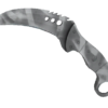 Esta karambit com um punho de marfim possui rebites de latão e uma lâmina parcialmente serrada, para que corte quando entrar em contacto com o alvo e rasgue a carne quando sair. Este item foi pintado com um efeito chamuscado.