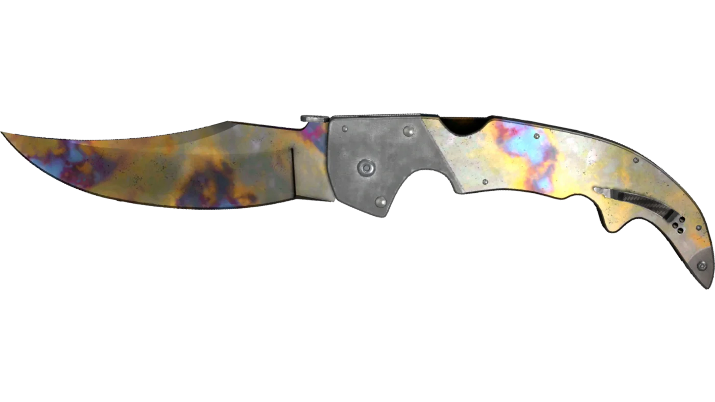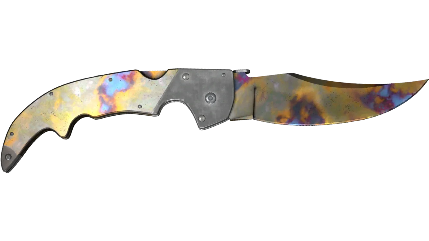 A lâmina endurecida e a parte principal do cabo estão cobertas de manchas azuis, violetas e amarelas. A frente e a parte de trás do cabo permanecem sem pintura.