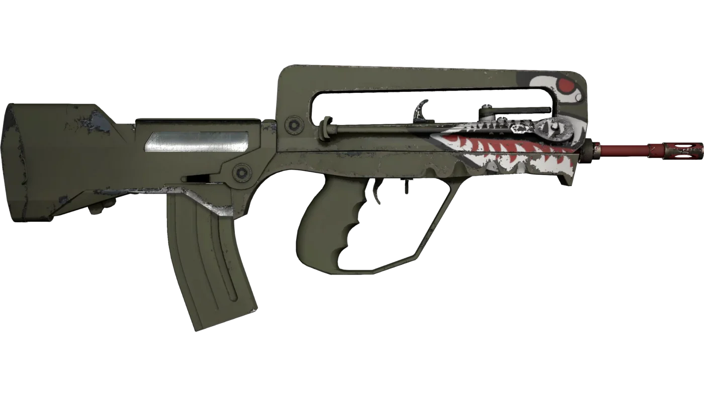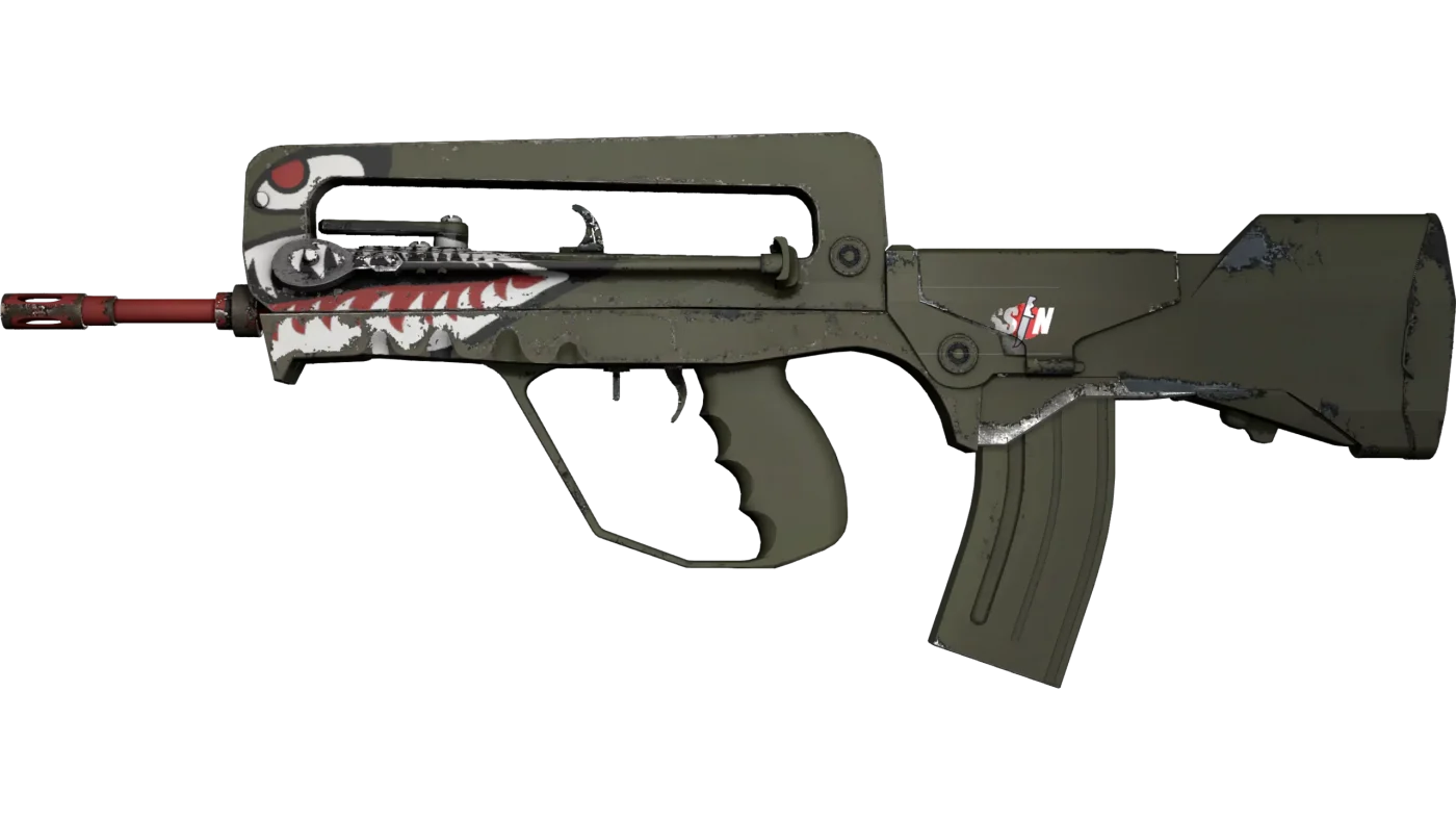 O corpo do rifle é pintado de cáqui sólido e adornado com a imagem de uma cabeça de tubarão com a boca aberta. O barril é pintado de vermelho sólido.