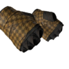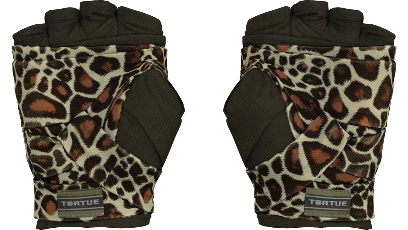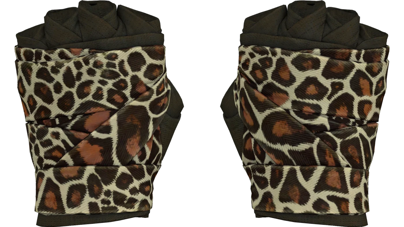 A camada interna das ataduras é feita de tecido marrom. A camada externa é feita de uma fita de lona com um padrão animal imitando pele de girafa. O design é feito em cores bege e marrom.