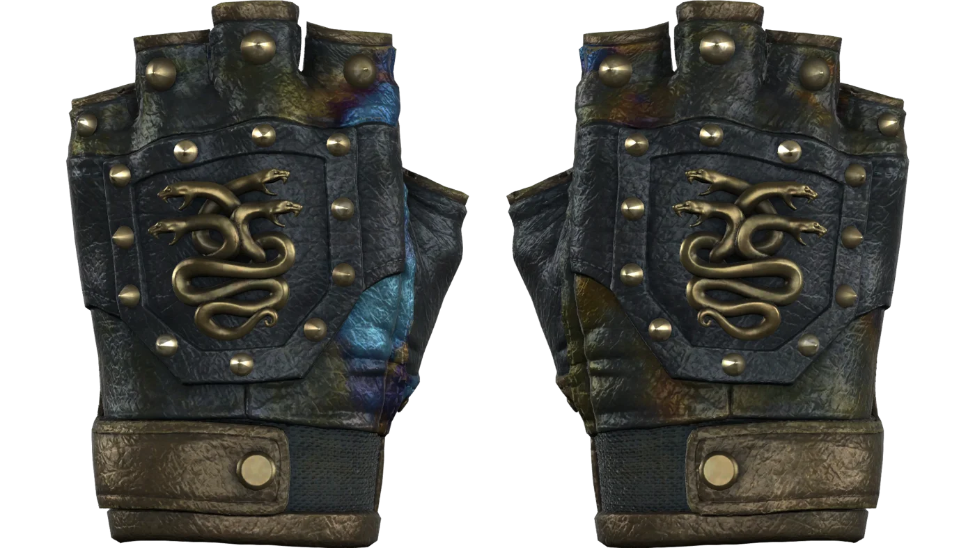 As luvas são feitas de couro tingido com corantes metálicos em vários tons de azul, amarelo e roxo. O design é complementado com tachas de latão e os logotipos da Operation Hydra.