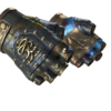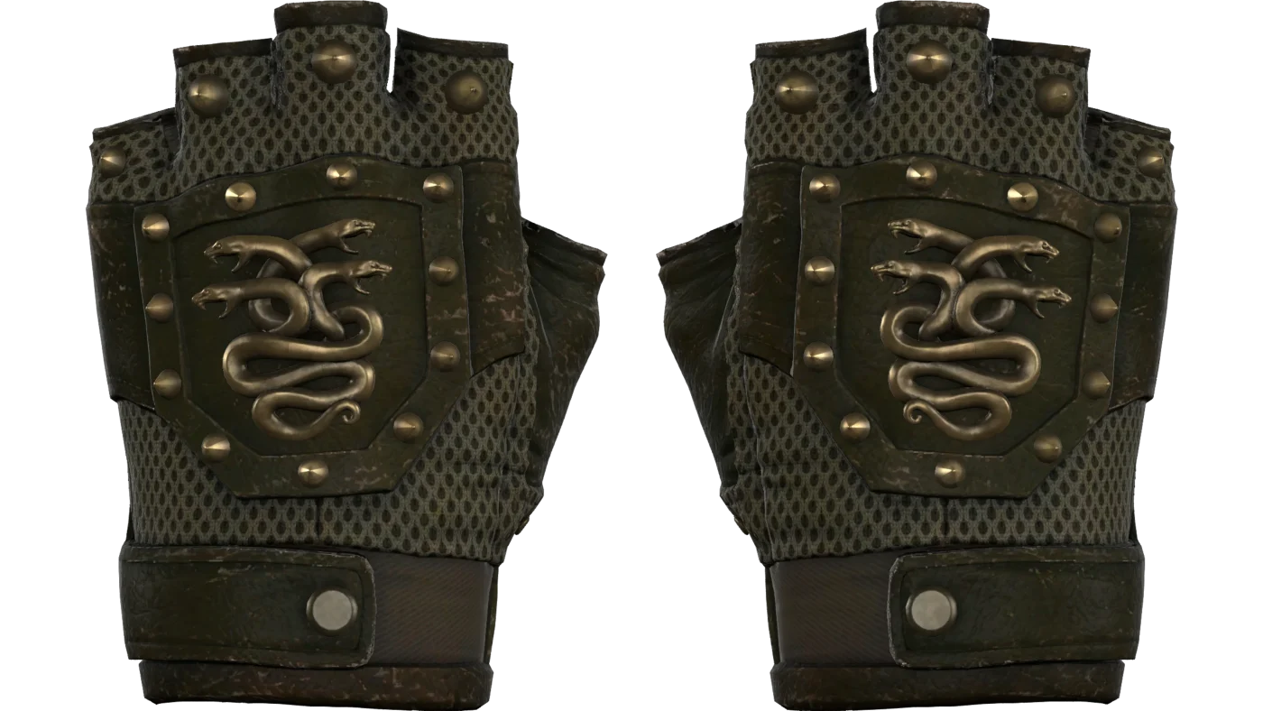 As luvas são feitas de couro verde e tecido de malha verde. O design é complementado com tachas de latão e os logotipos da Operação Hydra.