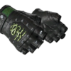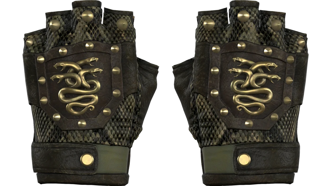 As luvas são feitas de couro marrom escuro e pele de cobra bege-marrom. O design é complementado com tachas de latão e os logotipos da Operação Hydra.