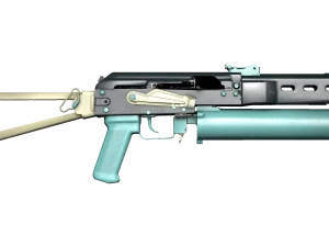 O corpo da metralhadora é pintado nas cores vermelho, cinza e branco. O fundo é adornado com numerosas inscrições de tamanhos diferentes que são digitadas com várias fontes. Algumas inscrições referem-se às características técnicas da arma. O design é complementado por várias imagens e ícones. Pequenas partes individuais do corpo são pintadas de amarelo.