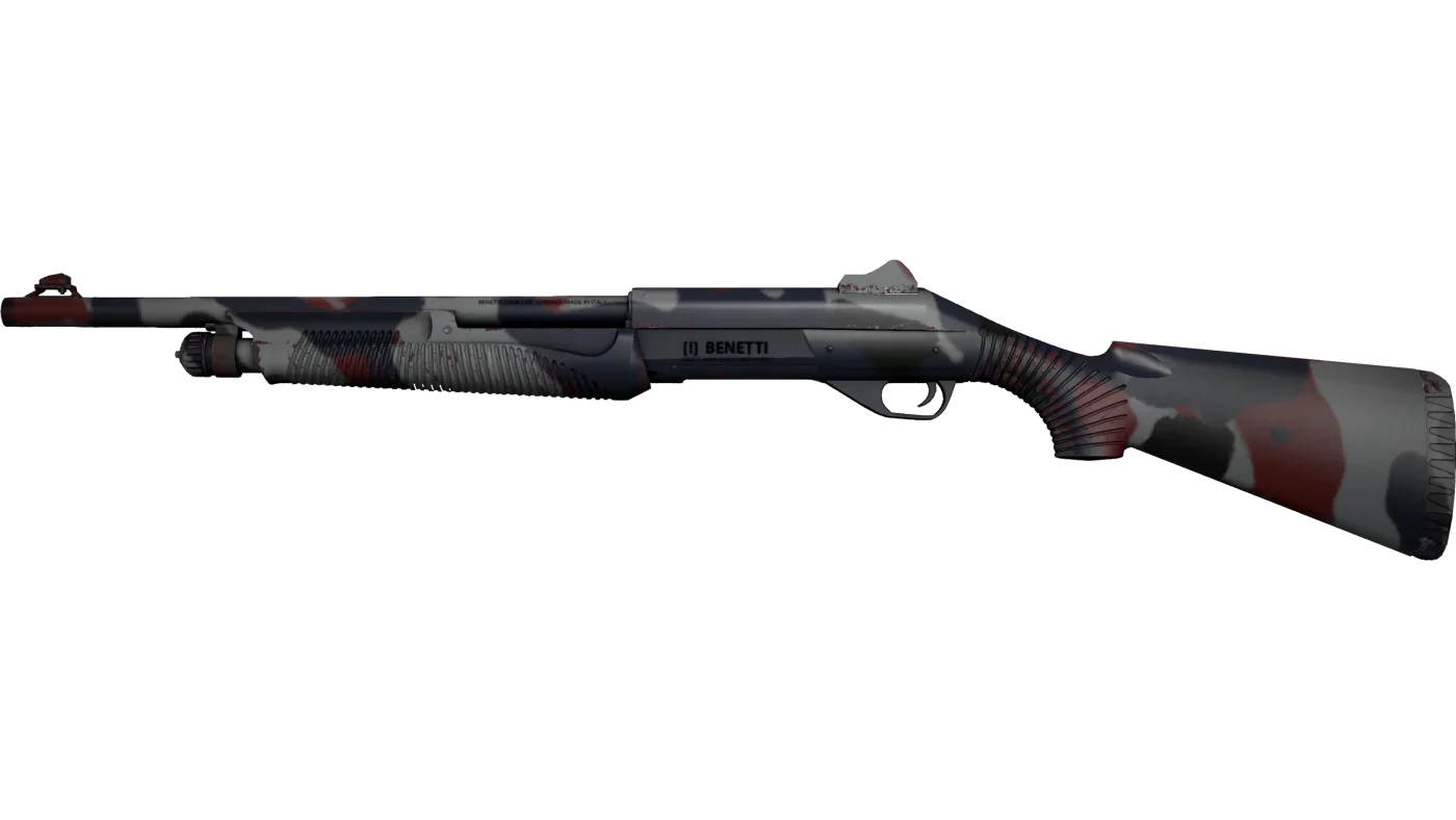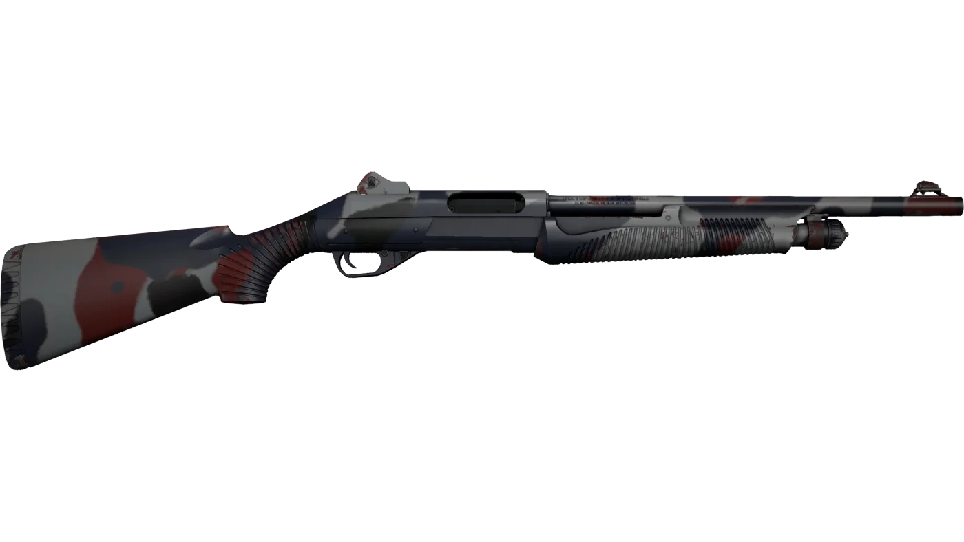 Todo o corpo da espingarda é adornado com um padrão de camuflagem nas cores cinza, vermelho e azul escuro.