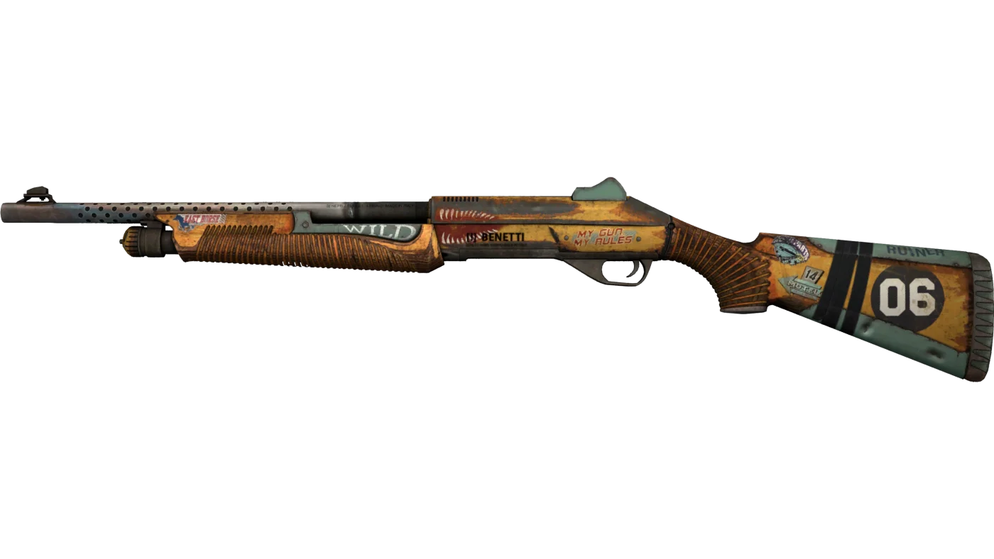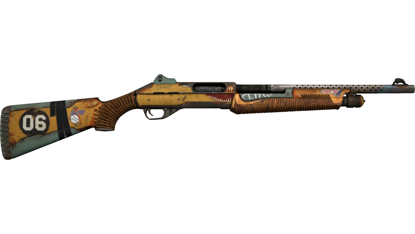 O corpo da espingarda é revestido com tinta amarelo-marrom e desgastado. A coronha e o protetor de mão são parcialmente decorados com placas de estanho cinza. O design é complementado por inúmeras imagens e inscrições que lembram adesivos antigos. A coronha é parcialmente envolta em fita adesiva preta.