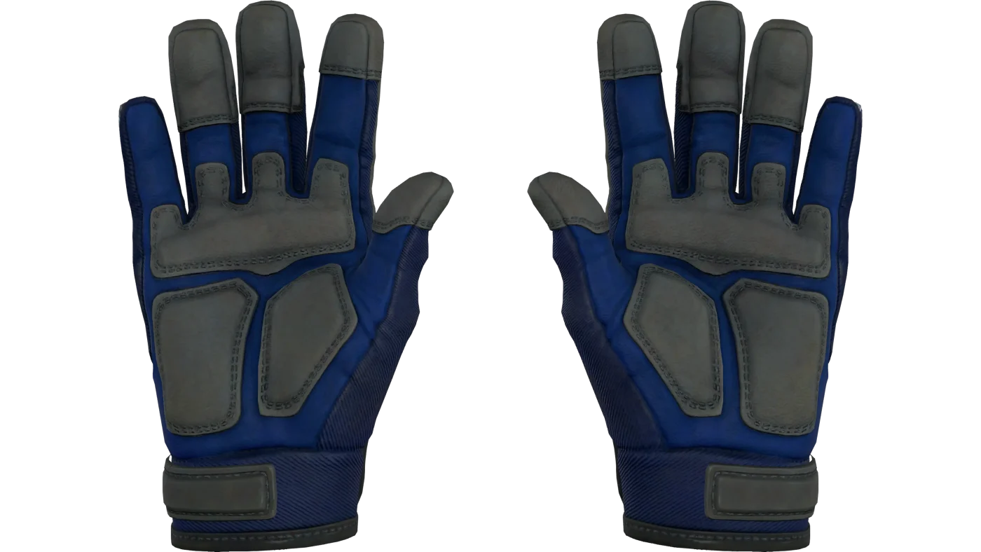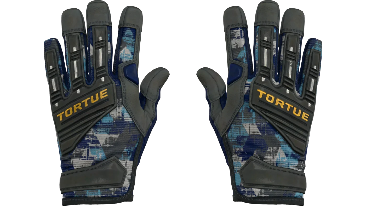 A parte superior das luvas é feita de um tecido áspero adornado com um padrão abstrato em tons de cinza-azulado. O design é complementado com inserções cinza emborrachadas. A parte da palma é feita de tecido azul e reforçada com inserções cinza.