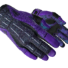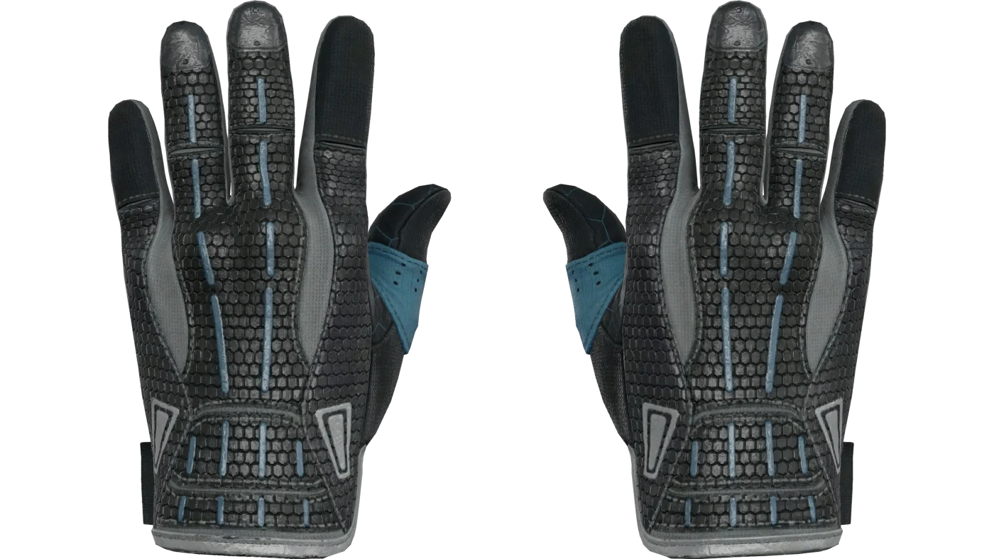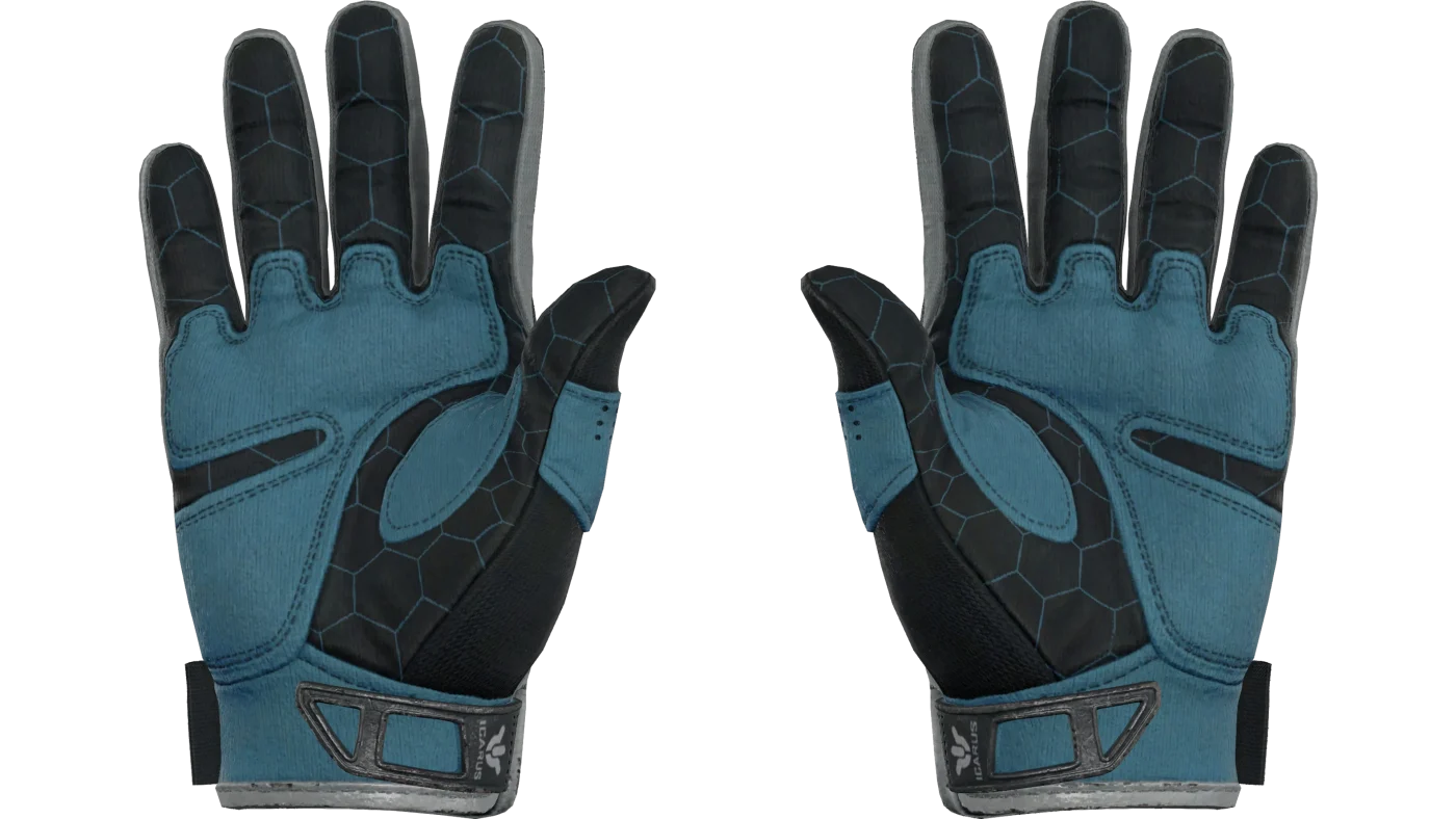 A parte superior das luvas é feita de um tecido cinza texturizado e complementado com inserções em cinza claro e detalhes em azul claro. A parte da palma é feita de tecido cinza escuro adornado com um padrão geométrico em azul, na forma de uma grade hexagonal, e reforçado com inserções em azul.